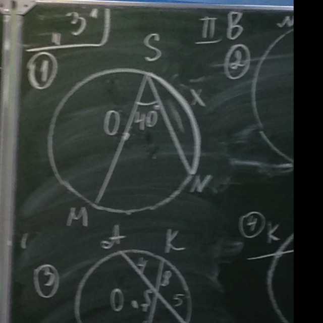 если найти градусную меру дуги, то она равна 100 градусов: угол MSN - вписанный, равен половине дуги, на которую опирается, значит дуга MN равна 80 гр.; MS - диаметр, он стягивает дугу в 180 гр, тогда х=180-80=100.