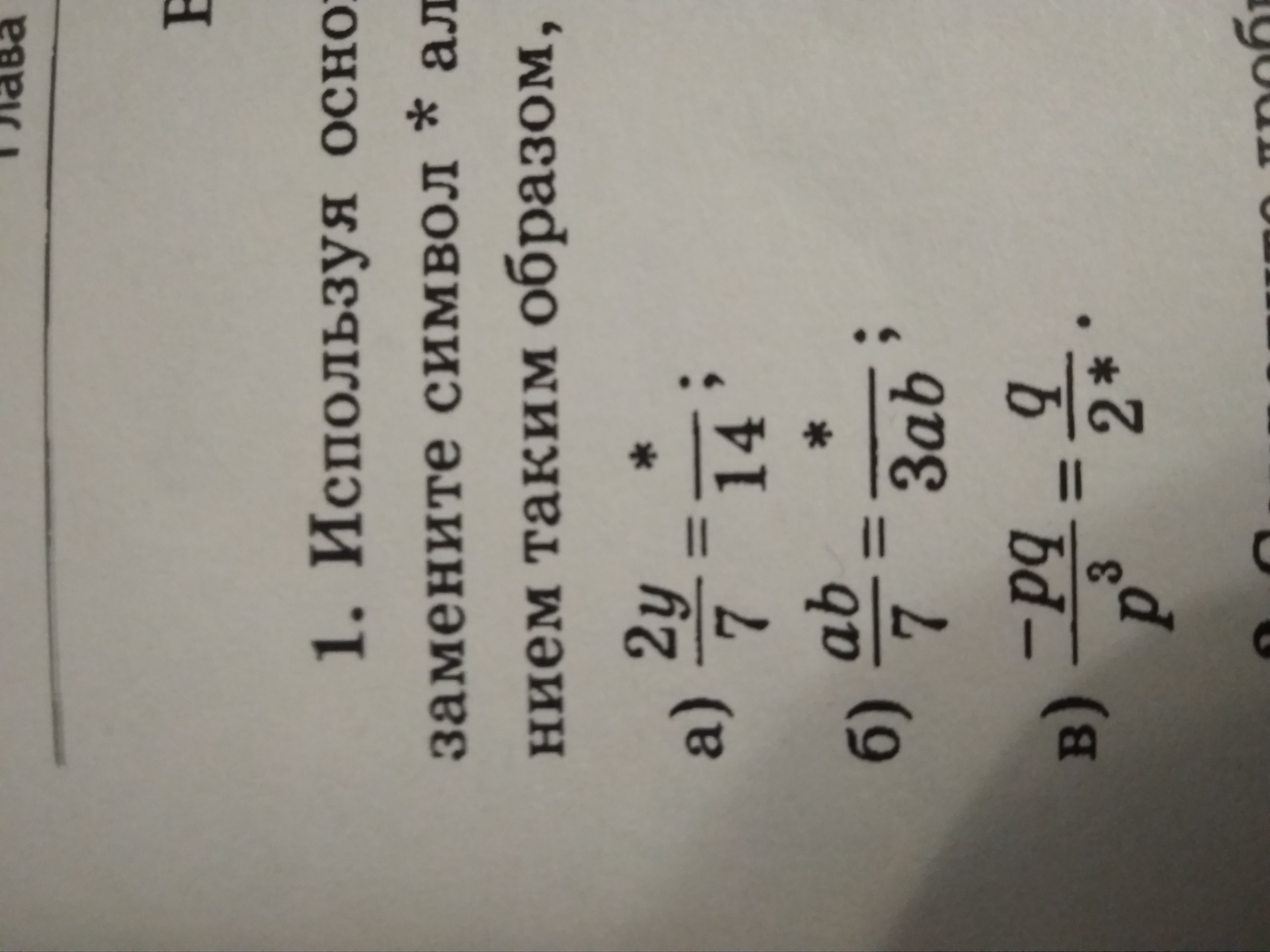 Используя основное свойство алгебраической дроби, замените символ алгебраическим или числовым выражением таким образом, чтобы получилось верное равенство.