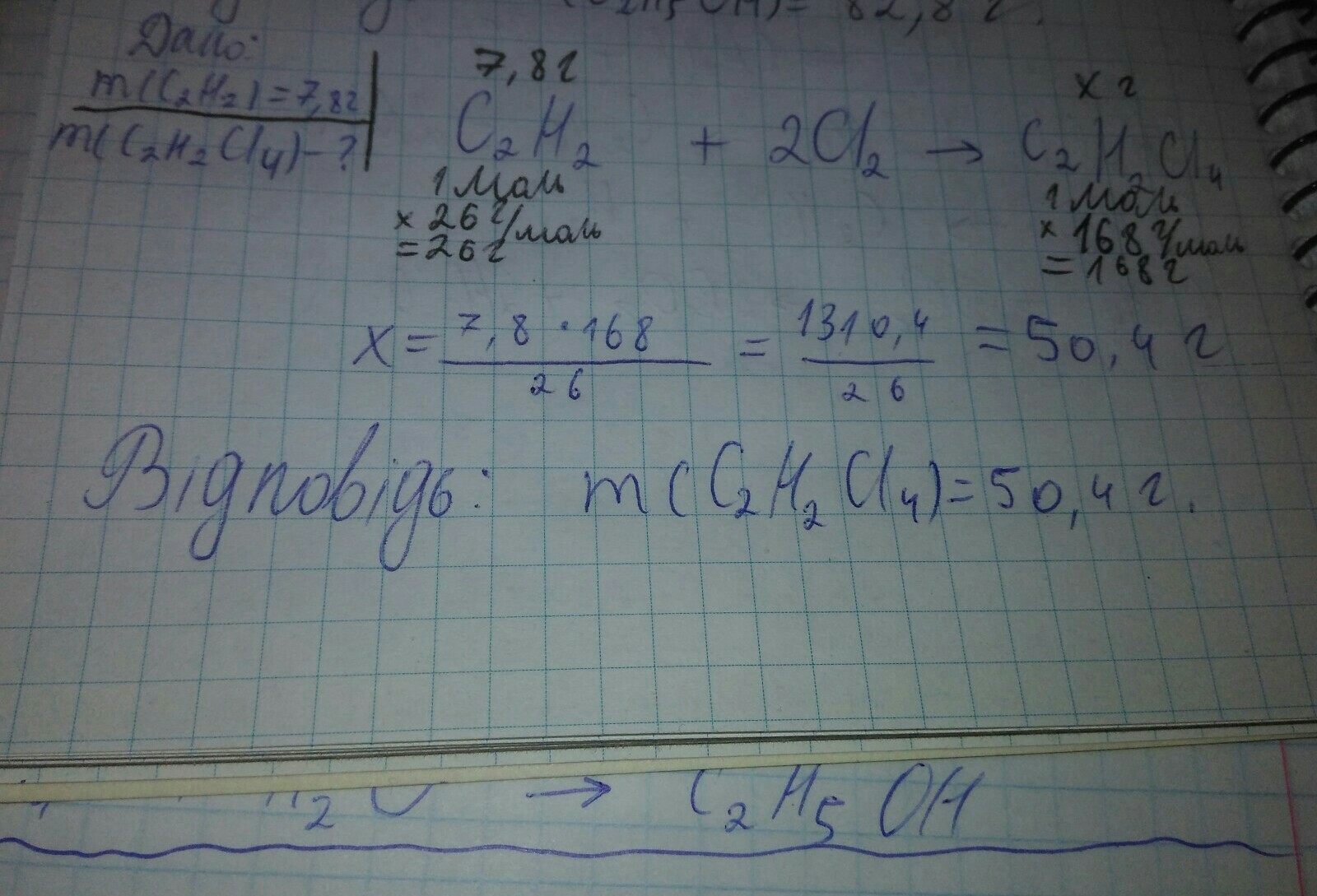 Обчисліть масу продукту повного хлорування етину масою 7,8 г