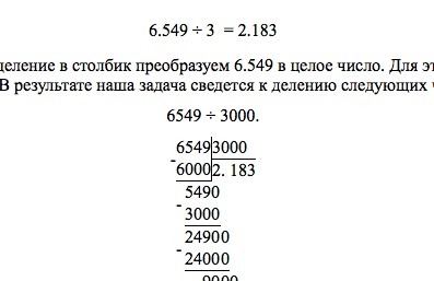Для того чтобы выполнить деление в столбик преобразуем 6.549 в целое число. Для этого умножим делимое 6.549 и делитель 3 на 1000. В результате наша задача сведется к делению следующих чисел: