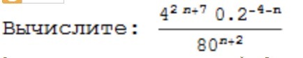 frac{4^{2n+7}0,2^{-4-n}}{80^{n+2}}=frac{2^{2(2n+7)}5^{4+n}}{(16*5)^{n+2}}=frac{2^{4n+14}5^{4+n}}{2^{4n+8}*5^{n+2}}=2^6*5^2=64*25=1600