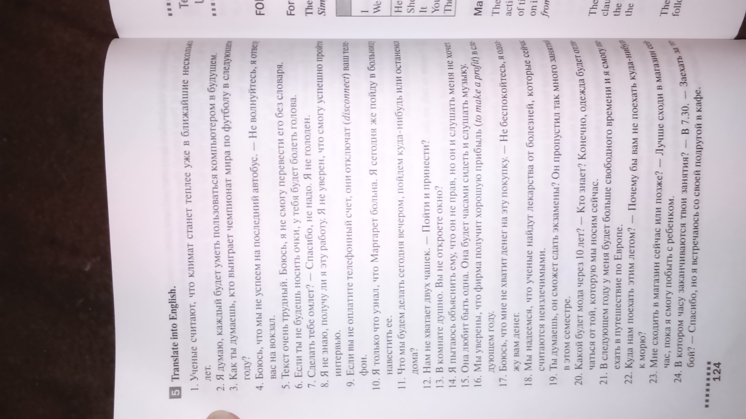 5 Translate into English 1. Scientists believe that the Kimat will become warmer in the next few 2. I think everyone will be able to use a computer in the future Z. How do you think who will win the world soccer championship 1 ner. onn 4. I'm afraid we won't make it to the last bus. _ Do not worry . take you to the station. 5. The text is very difficult. Boks, I can't ne 6. If you don’t wear glasses. You will have a headache. 7. Make you an omelet? -No, thanks . I am not roa0eH 8. I do not know if I will get this job. I’m not sure if the smog is successful, take it without caosane, For The Sin interview. 9. If you don’t pay your phone bill, they’ll turn off (disconneen saiu teo 10. I’ve just found out that Margaret is sick. I’ll go to HancctHTh CC 1 1 today, tITO MM will love you tonight, go somewhere or The rest is at home? 12. We don’t have enough two cups .. Please come and bring it? 13. You don’t have a window in the room. Do not open the window? 14. I try to explain to him that he is not a rrpan, but he doesn’t listen to me either, inp 15. lkbits to be alone. She will sit for hours and listen to music. 16. We are at a place that the firm will get a good profit (tonnake aprufinna, we are blowing rory. 17. I'm afraid that I don’t have enough money Kupku - Do not worry, rechA I’m gonna give you a day, 18. We hope that scientists will find cures for diseases that are 19. Do you mind, he can pass exams? He missed so many 20. What will be the fashion in 10 years.Who knows? Of course , clothes b yat 21.8 sitting I will have more free time and I will be 22. Will we go to the summer party? -Why don't you go 23. Should I salt the store now or after? -Better go to 24. In which ..as your classes end. At 7.30 .- in this rpe semes. Chatting from the one we’re now. Going on a trip to Europe. To the sea? An hour, until I can stay with the child. Fight? -Thanks, but I get away with my nonpyroin Kate. 124