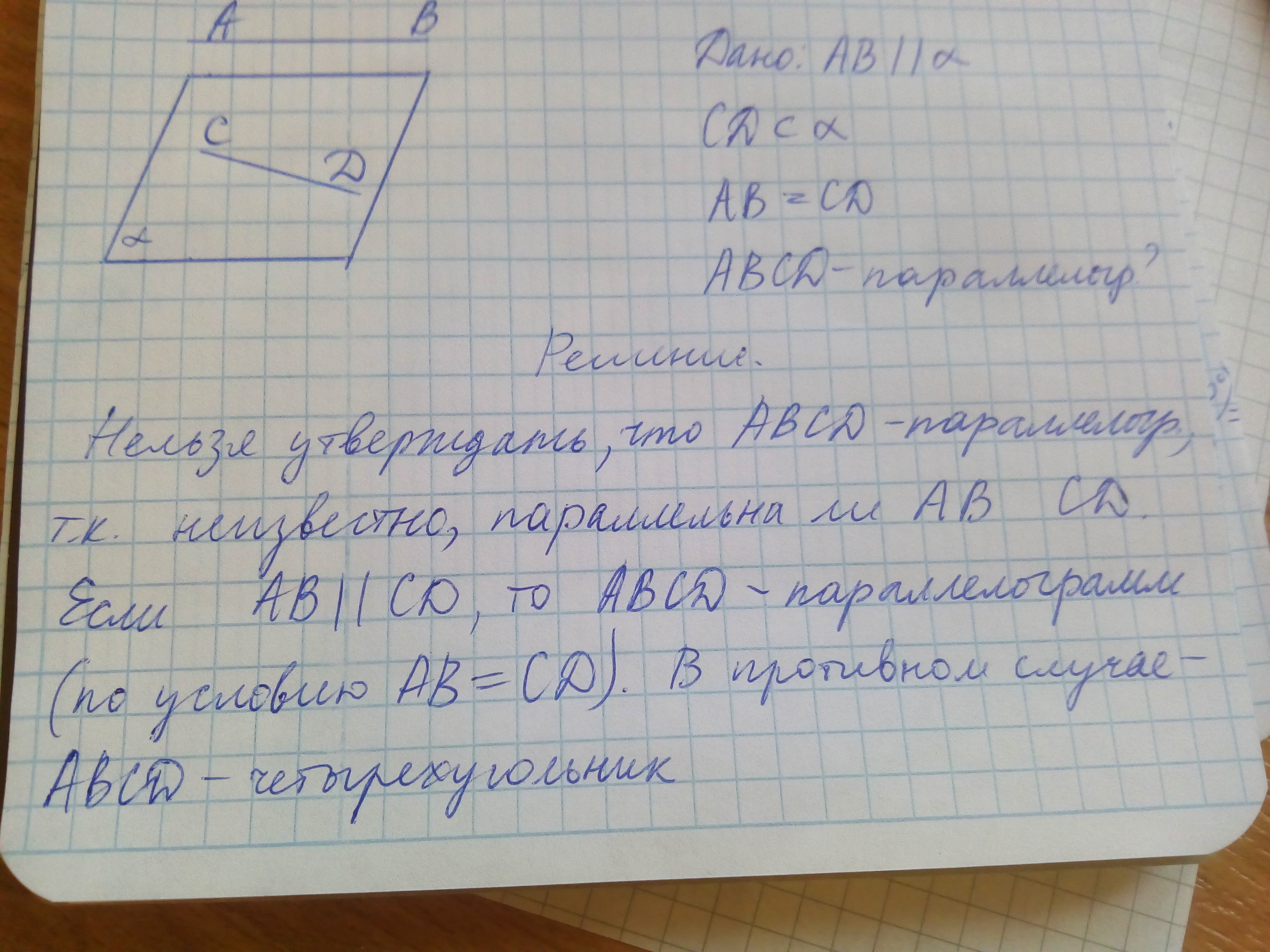 отрезок AB параллелен плоскости альфа, а отрезок CD лежит в этой плоскости, причем AB=CD. Можно ли утверждать, что четырехугольник ABCD-параллелограмм? Поясните. С рисунком.