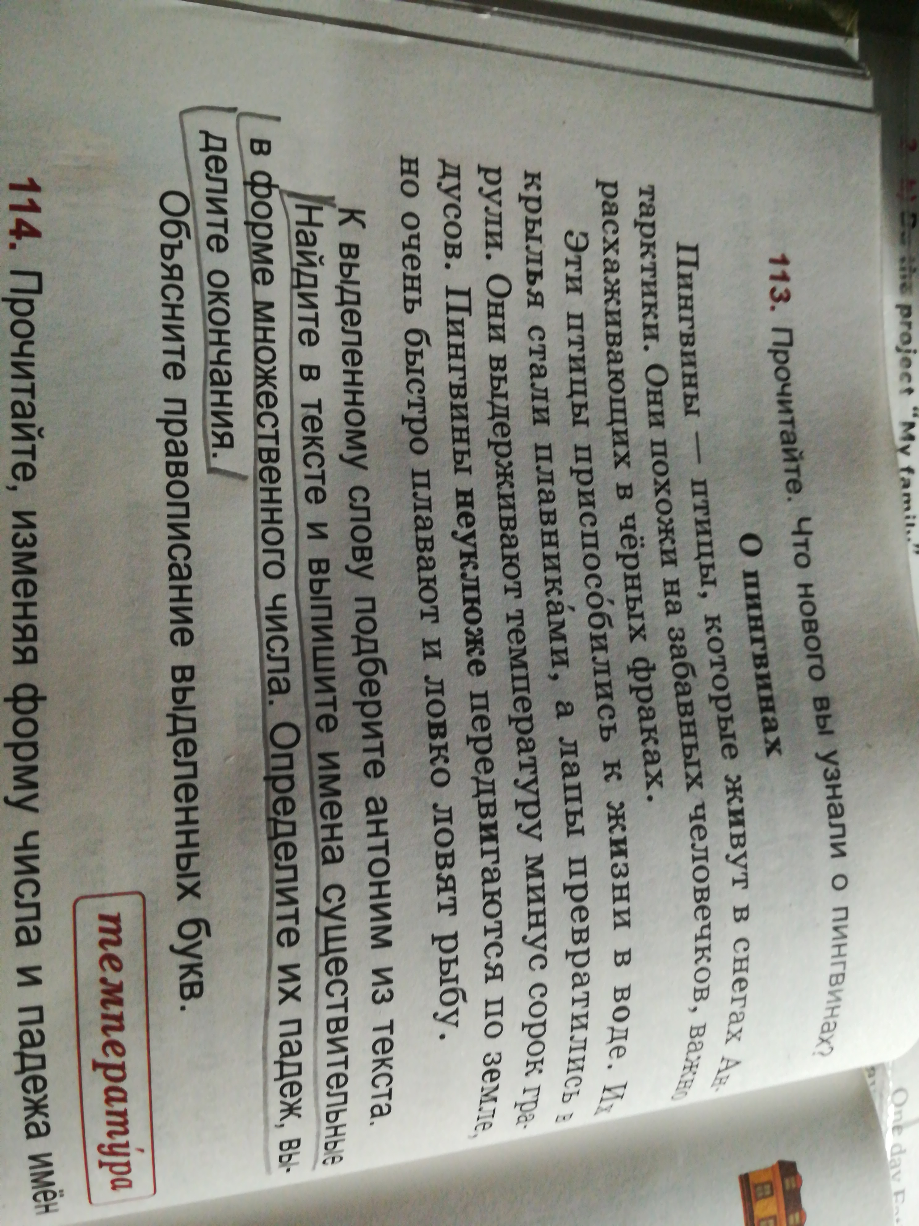 Существительные во мн.ч. - птицы - падеж именительный, снегах падеж предложный, человечков родительный падеж, фраках предложный падеж, крылья именительный падеж, плавниками творительный падеж, лапы именительный падеж, рули винительный падеж, градусов именительный падеж, пингвины именительный падеж.