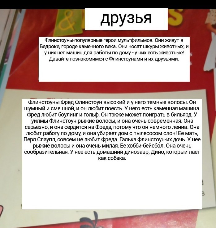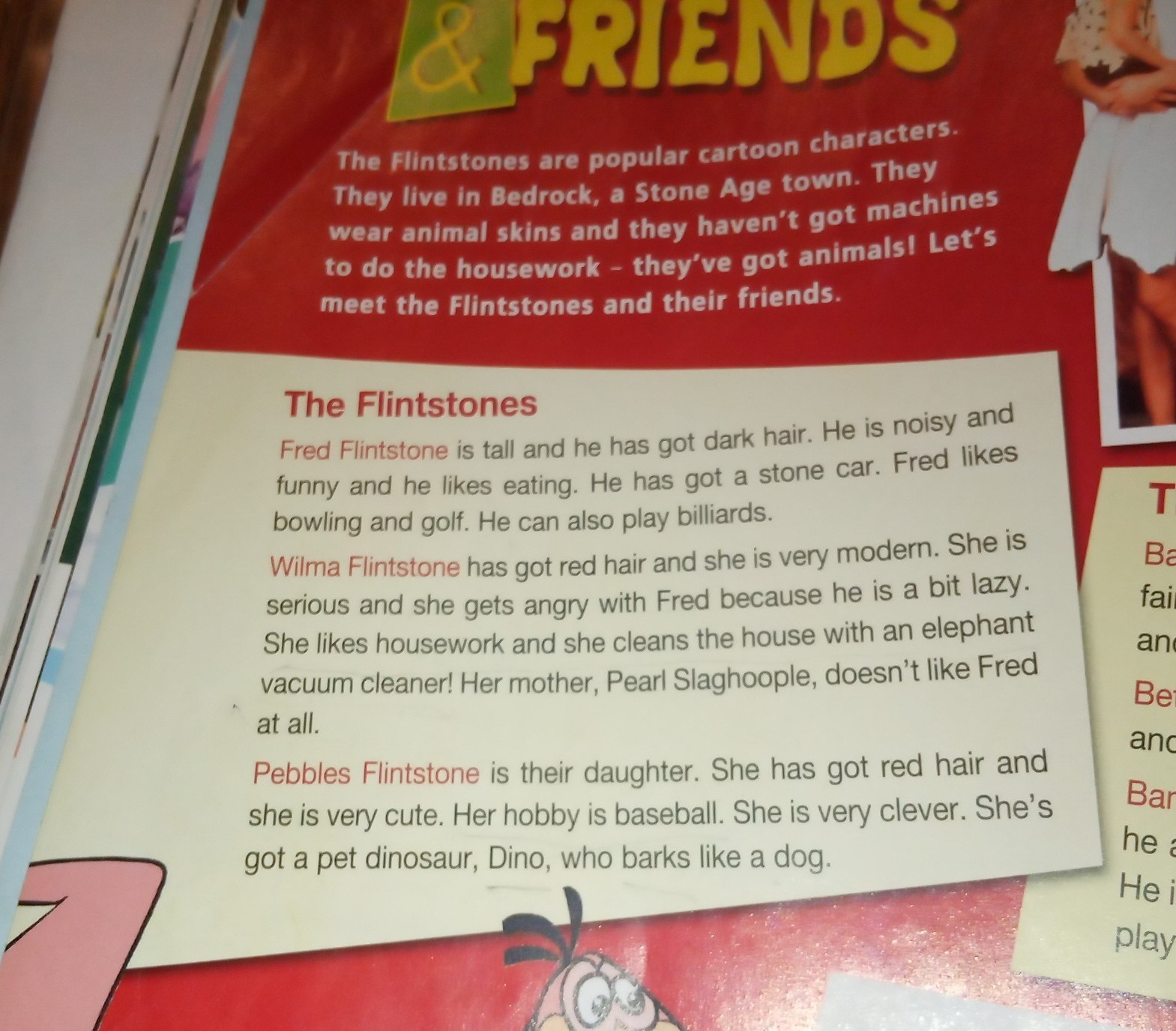 Флинстоунс Фред Флинтстон высок, и у него темные волосы. Он шумный и забавный, и ему нравится есть. У него есть каменная машина. Фред любит боулинг и гольф. Он также может играть в бильярд. У Вильмы Флинтстон есть рыжие волосы, и она очень современна. Она серьезно, и она злится на Фреда, потому что он немного ленив. Она любит домашнюю работу, и она очищает дом пылесосом-слоном! Ее мать, Перл Слагхооп, совсем не любит Фреда. Галька Флинтстон - их дочь. У нее рыжие волосы, и она очень симпатичная. Ее хобби - бейсбол. Она очень умна. У нее есть динозавр, Дино, который лает как собака.
