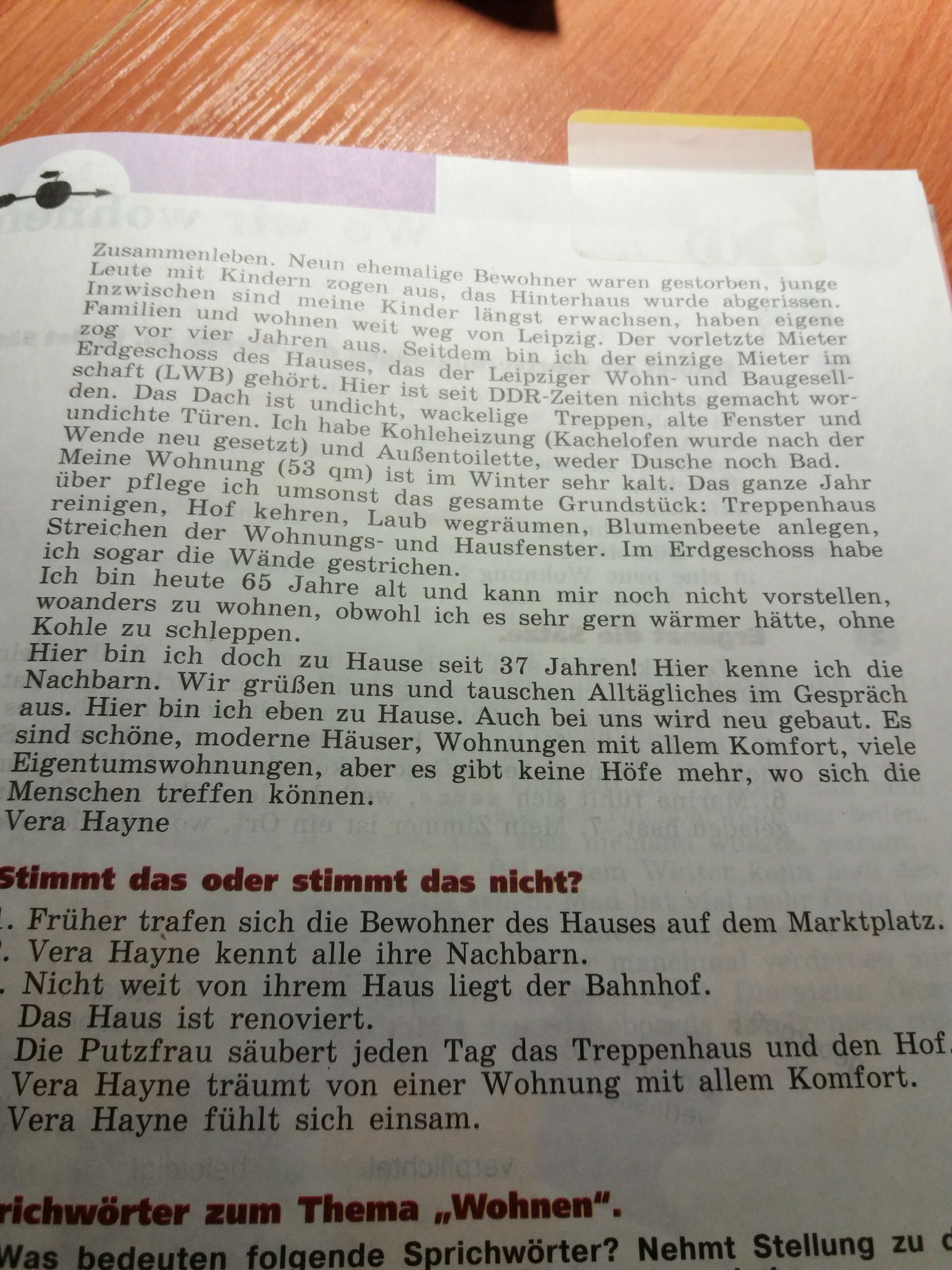 Совместная жизнь. Девять бывших жителей умерли, молодежь и дети переехали,задний корпус разрушен. Между тем мои дети давно выросли , имеют собственные семьи и живут далеко от Лейпцига. Предпоследний житель переехал четыре года назад. С тех пор я единственный житель первого этажа дома, который относится Лейпцигской жилищно - строительной компании( обществу). Здесь еще с ГДР - овских времен ничего не сделано. Прохудившаяся крыша, шаткие ступени, старые окна, и неплотно закрывающиеся двери. У меня печное отопление( изразцовая печь была построена после перемен) , и наружный туалет, ни душа ни бани. Моя комната, площадью 53 квадратных метра зимой очень холодная. В течение всего года я выполняю общественные обязанности: чистить лестничные пролеты, подметать двор, убирать листву, сажать ( разбивать) цветочные клумбы, красить окна дома и квартиры. На первом этаже я покрасила даже стены.