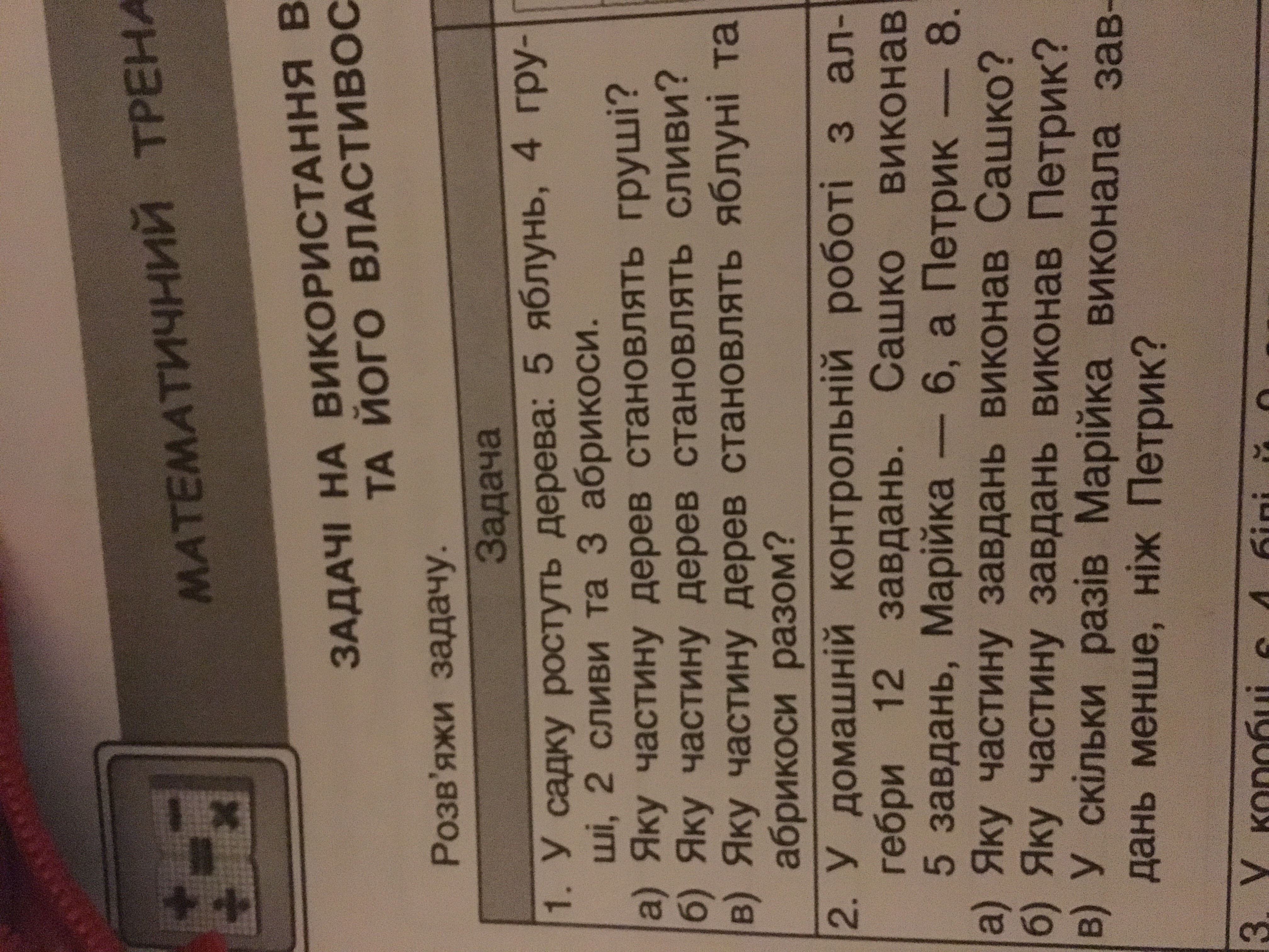 в) 5+3/(5+4+2+3)=8/14=4/7 деревьев составляют яблони и абрикосы вместе