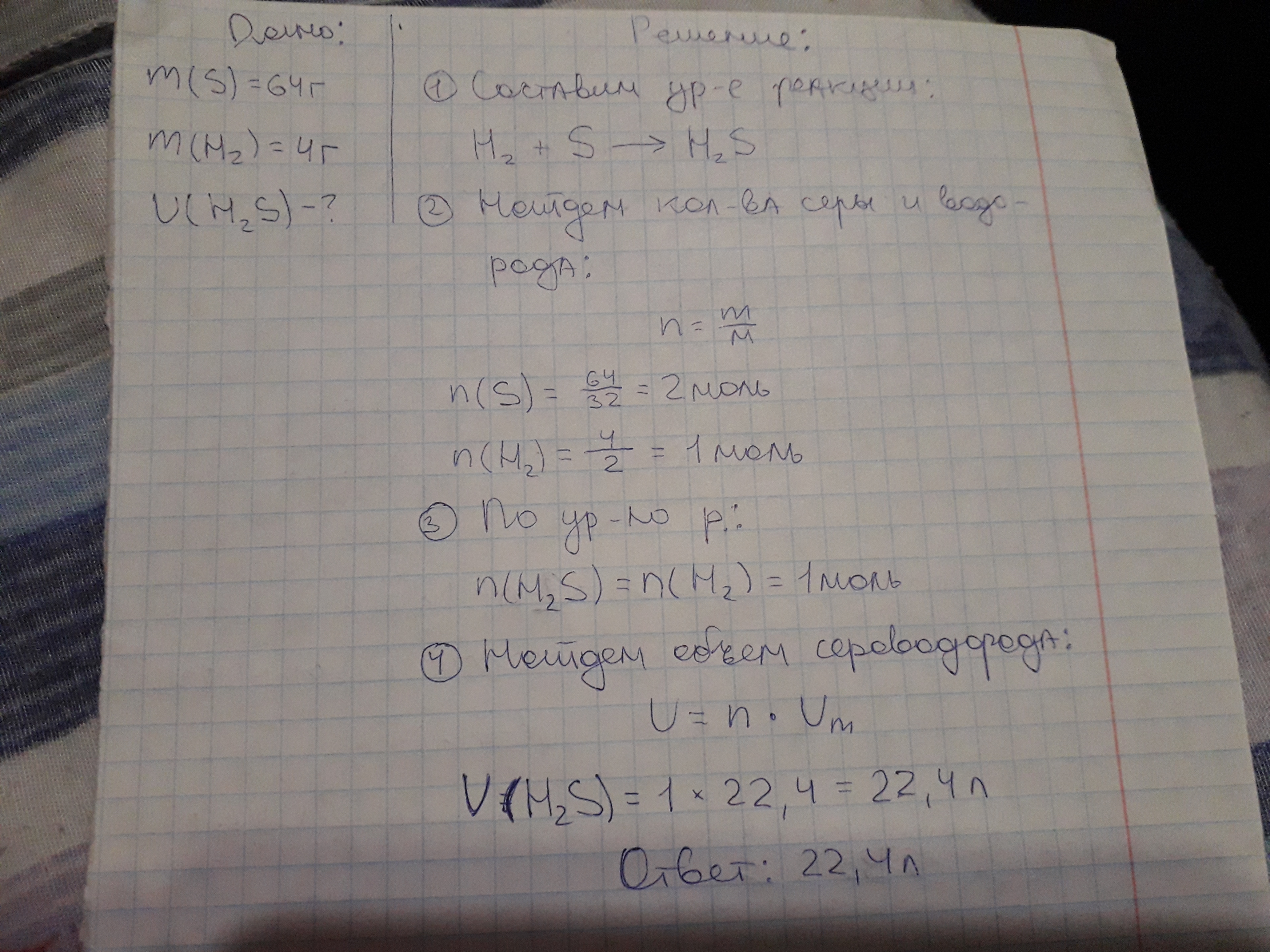 Объем сероводорода равен 22.4 литров
