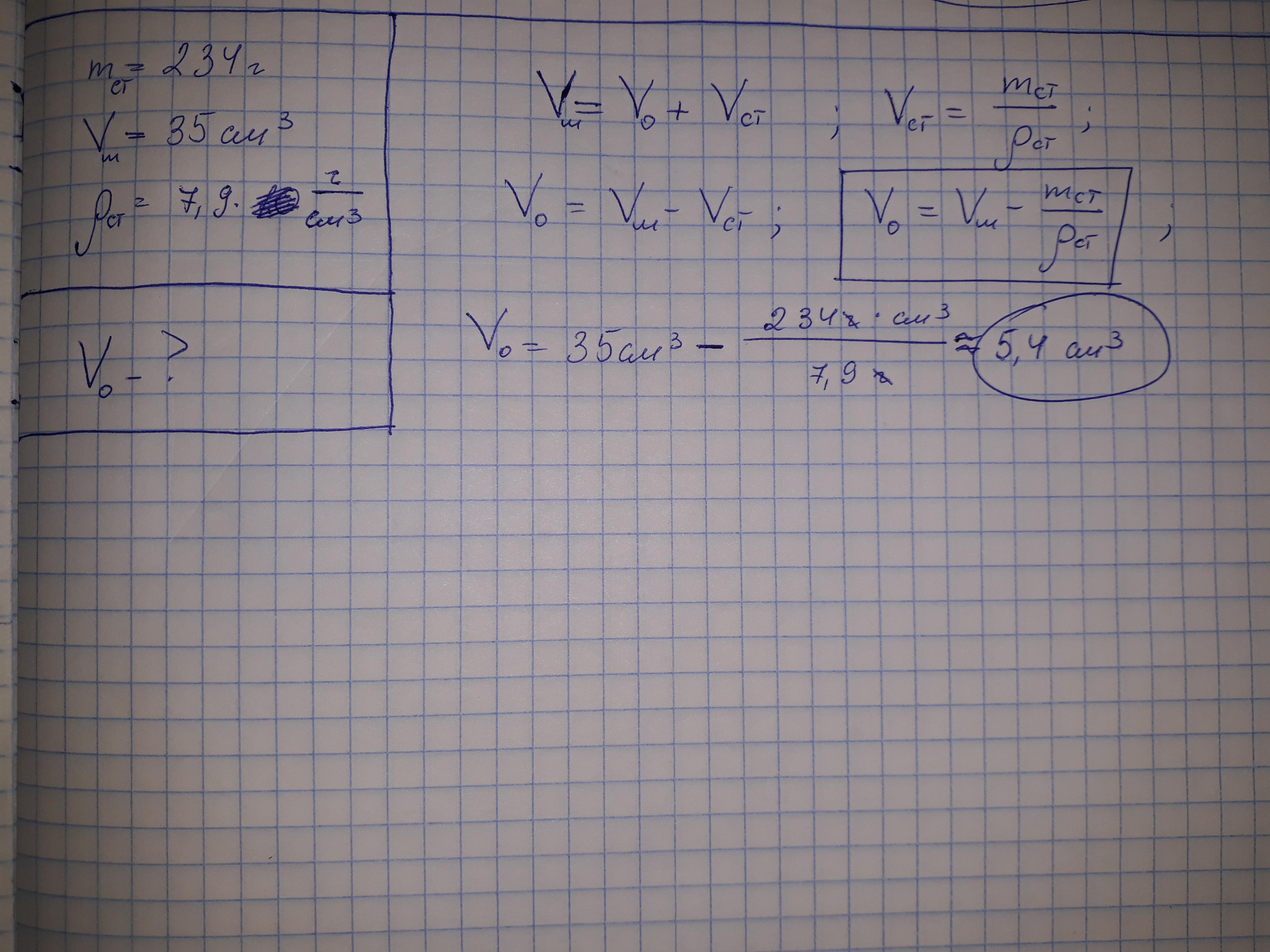 что составляет 273 грамм. Из-за полости его вес меньше на 273-234 = 39 грамм, следовательно, ее объем, равен: м3 или 5 см3.