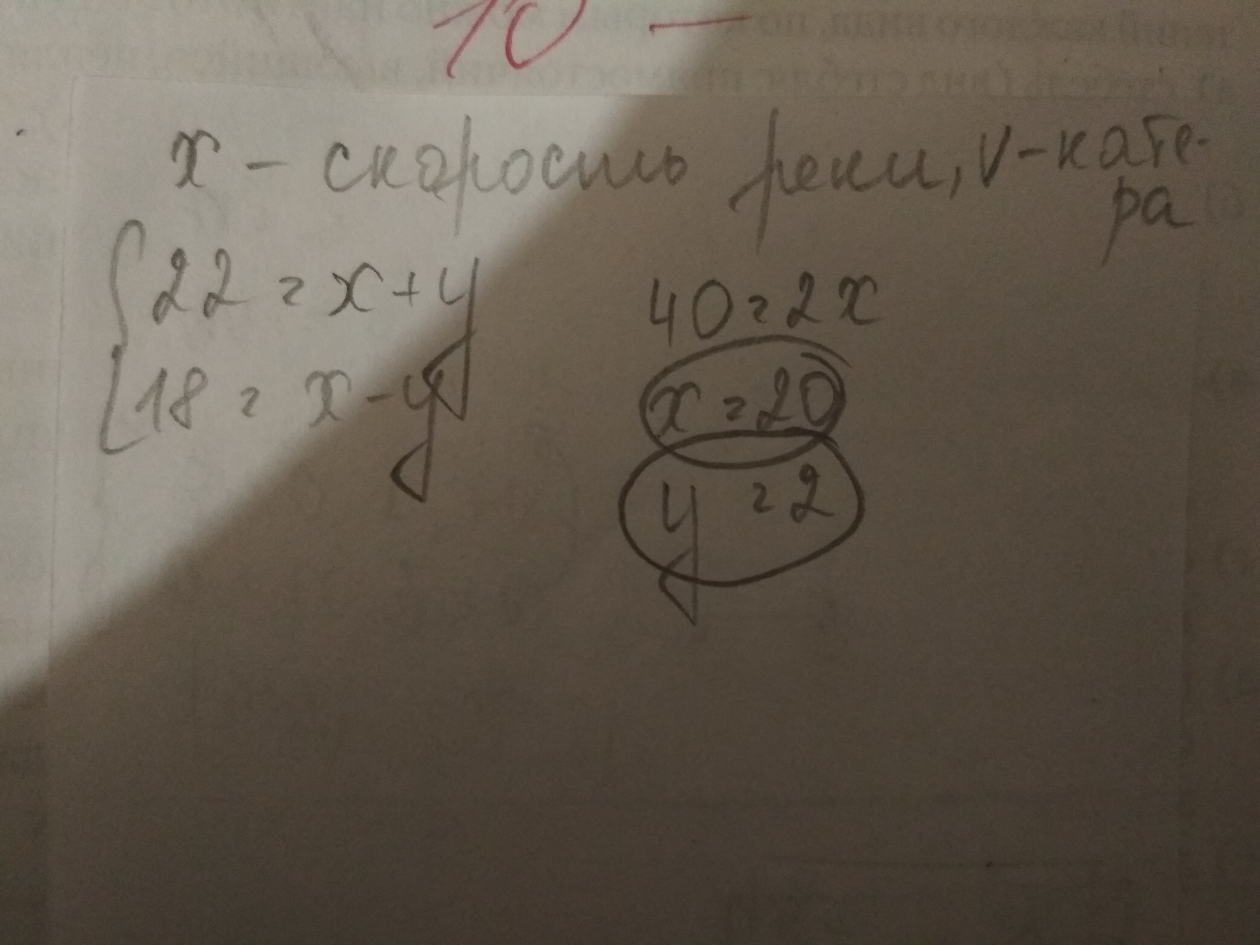 Скорость катера по течению реки 22 км/ч ,а против течения18км/ч найти:а) скорость течения реки ? б)собственную скорость катера? СРОЧНО НУЖНА КРАТКАЯ ЗАПИСЬ