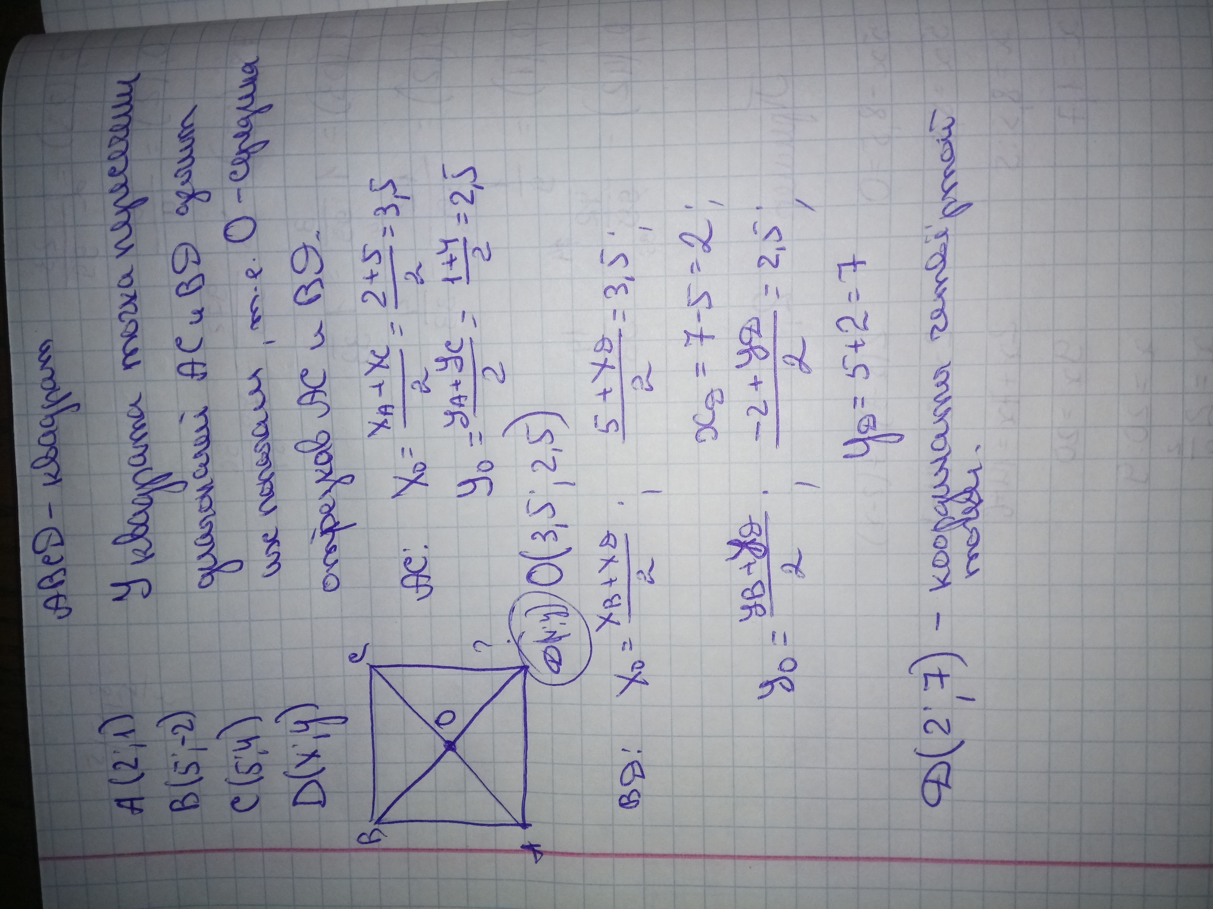 Даны три вершины квадрата А (2;1) ; В (5;-2) ; С (5;4) Найти четвертую точку