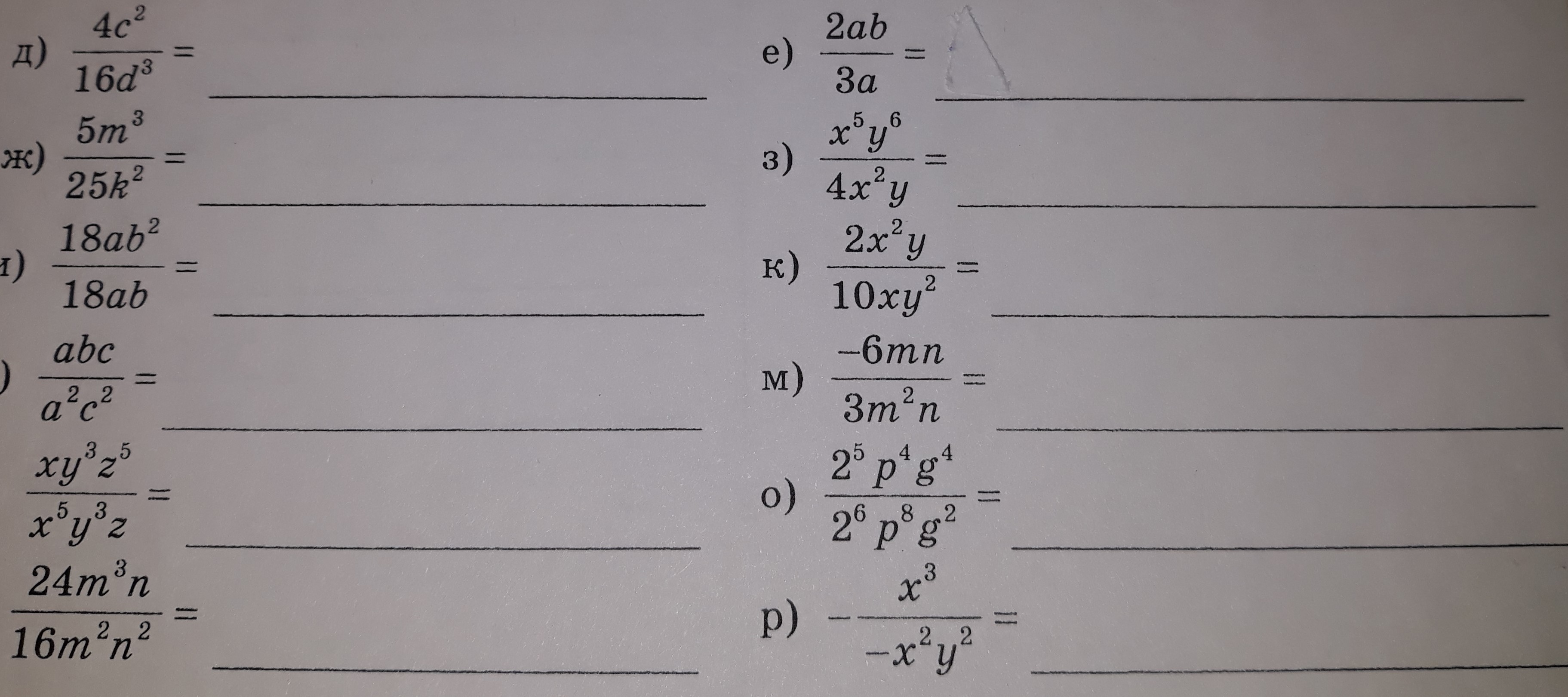 д) с²/4d; ж) m/5; b/1; b/ac; z⁴/x⁴; 3m/2n; 2b/3; x³y5(степень)/4; x/5y; м) -2/m; o) g²/p⁴; p) -x/-y²;