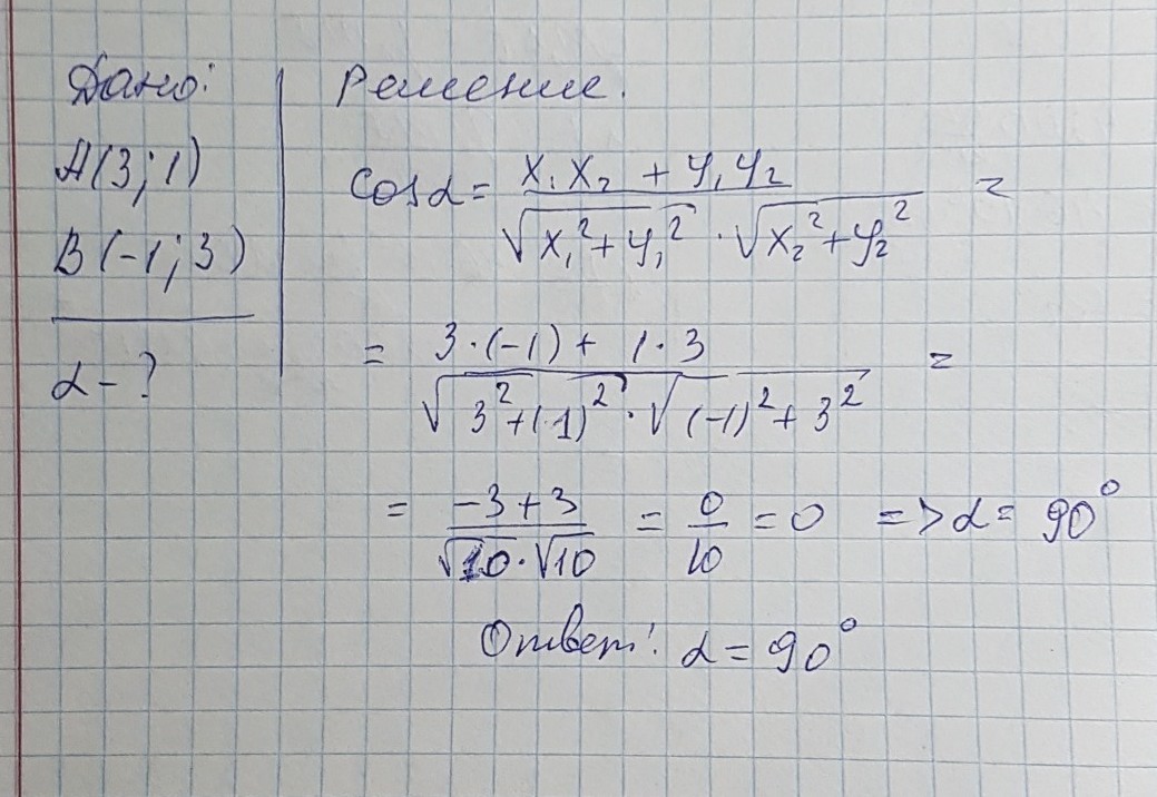 Найти угол между векторами A(3:1) и B (-1:3) срочно пж