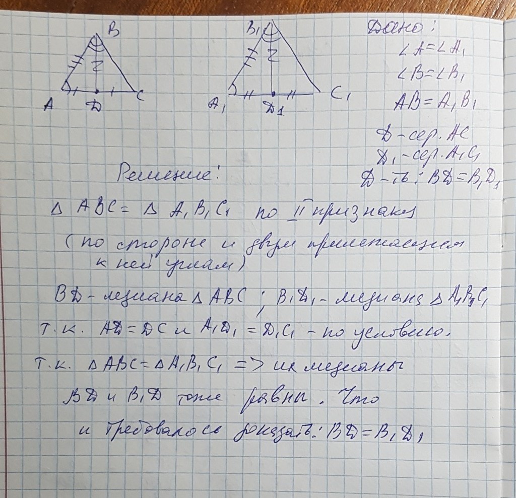 Треугольники равны. Значит, и их медианы равны. Значит, BD = B1D1.