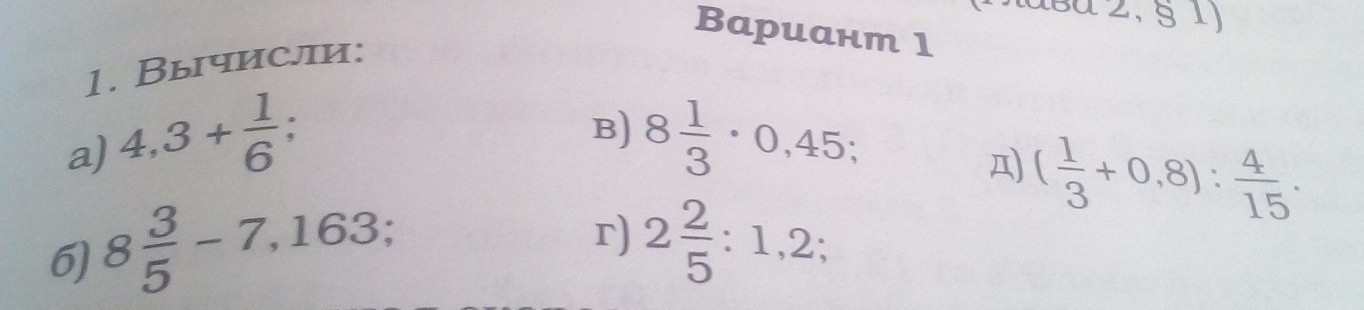 д)( 1/3+ 0,8)÷4/15=4/5÷4/15=3