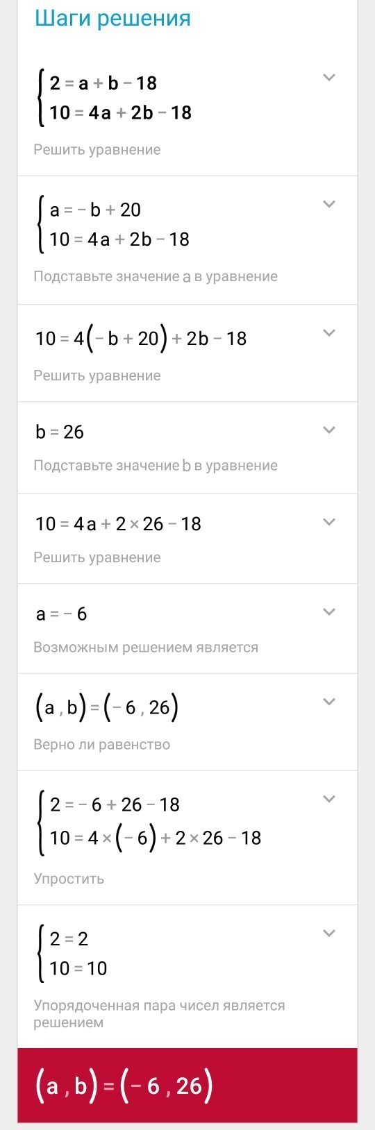 y = ax^2 + bx - 18 равно 10 = 4x + 2b - 18