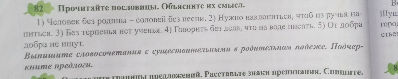 Словосочетания с сущ-ми в Р.п.: человек без родины, соловей без песни, из ручья напиться, нет ученья, говорить без дела, добра не ищут.