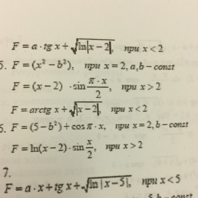 x<2?arctan(x)+sqrt(abs(x-2)):x=2?(5-b*b)+cos(pi*x):ln(x-2)*sin(x/2)));