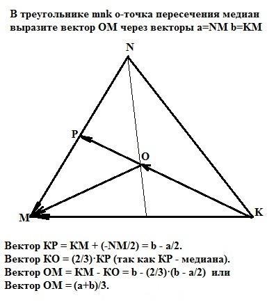 Вектор КО = (2/3)·КР = (2/3)·(b - a/2) (так как КР - медиана и делится точкой Р в отношении 2:1, считая от вершины).