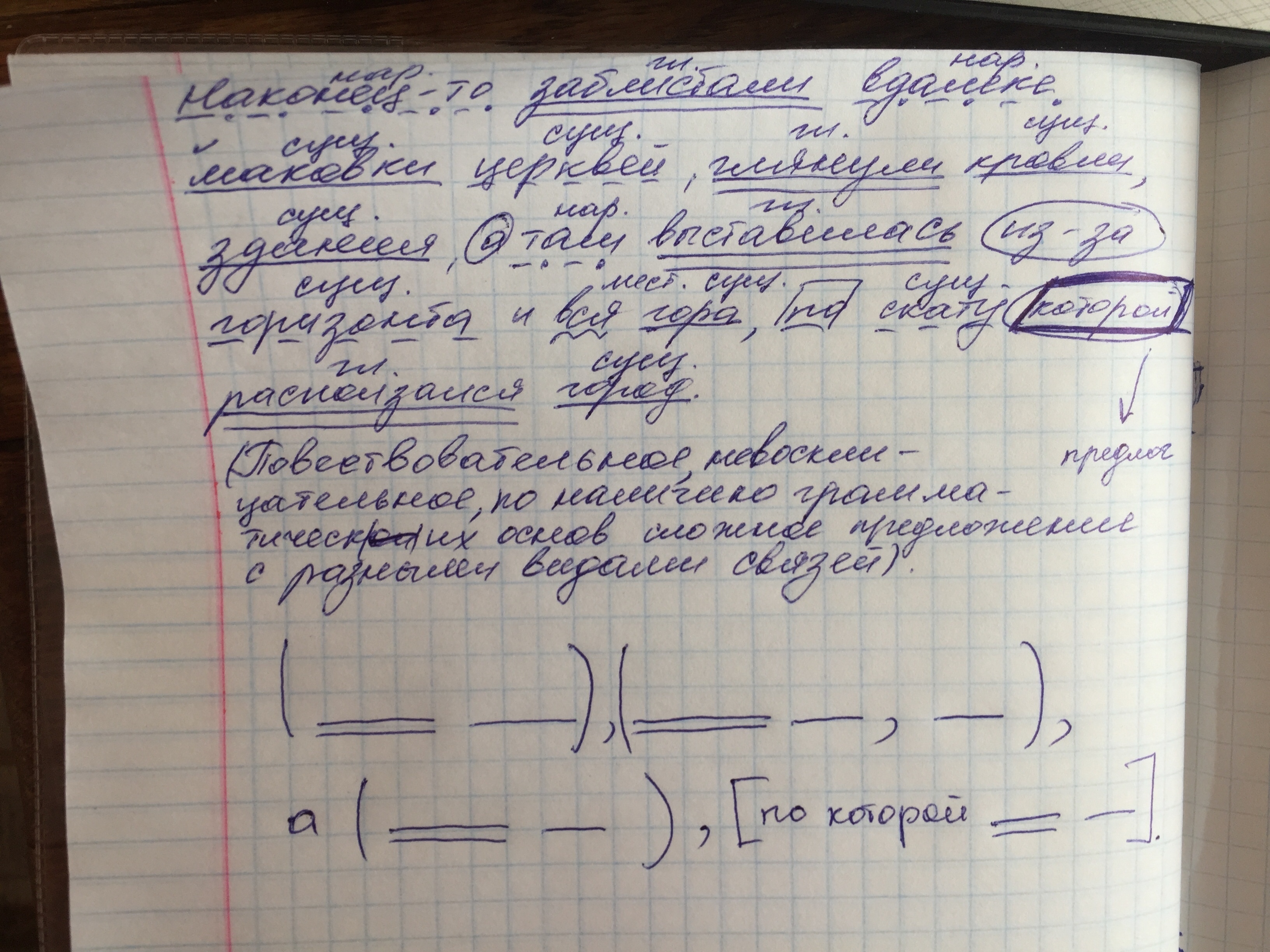 Наконец-то заблистали вдалеке маковки церквей, глянули кровли, здания, а там выставилась из-за горизонта и вся гора, по скату которой расползался город. Сделайте Синтаксический разбор