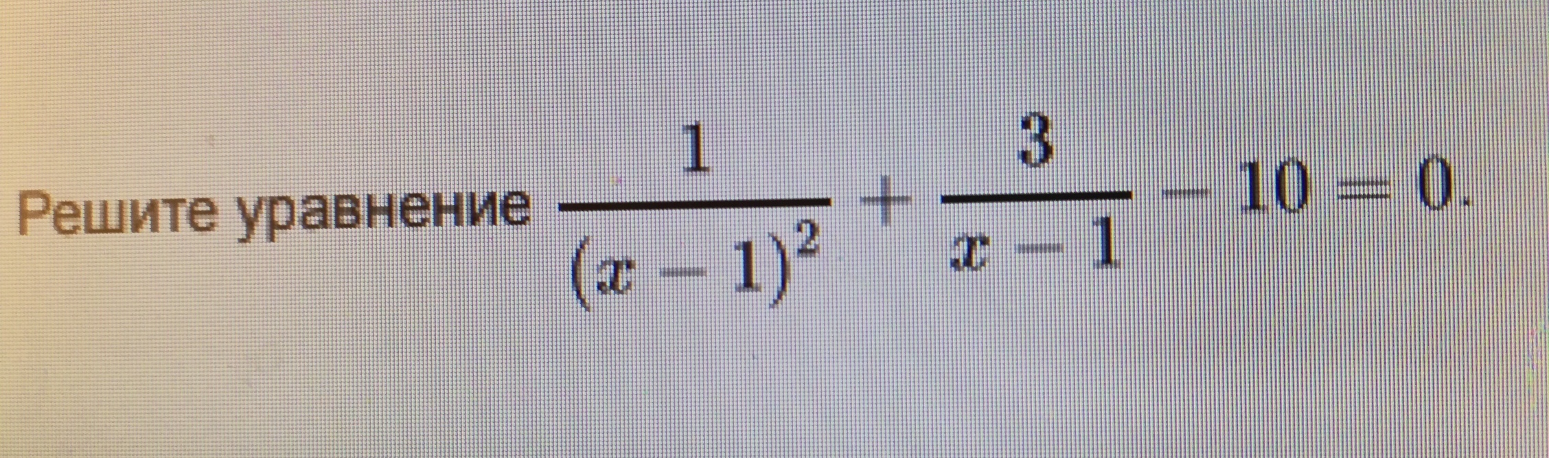 x не должен равняться 1. получаем: 1+3*(x-1)-10*(x-1)^2=0; 1+3x-3-10x^2+20x-10=0; -10x^2+23x-12=0. умножаем на (-1): 10x^2-23x+12=0; D=(-23)^2-4*10*12=529-480=49; x1=(23-7)/20, x2=(23+7)/20. x1=4/5, x2=3/2. Ответ: x1=4/5, x2=3/2.