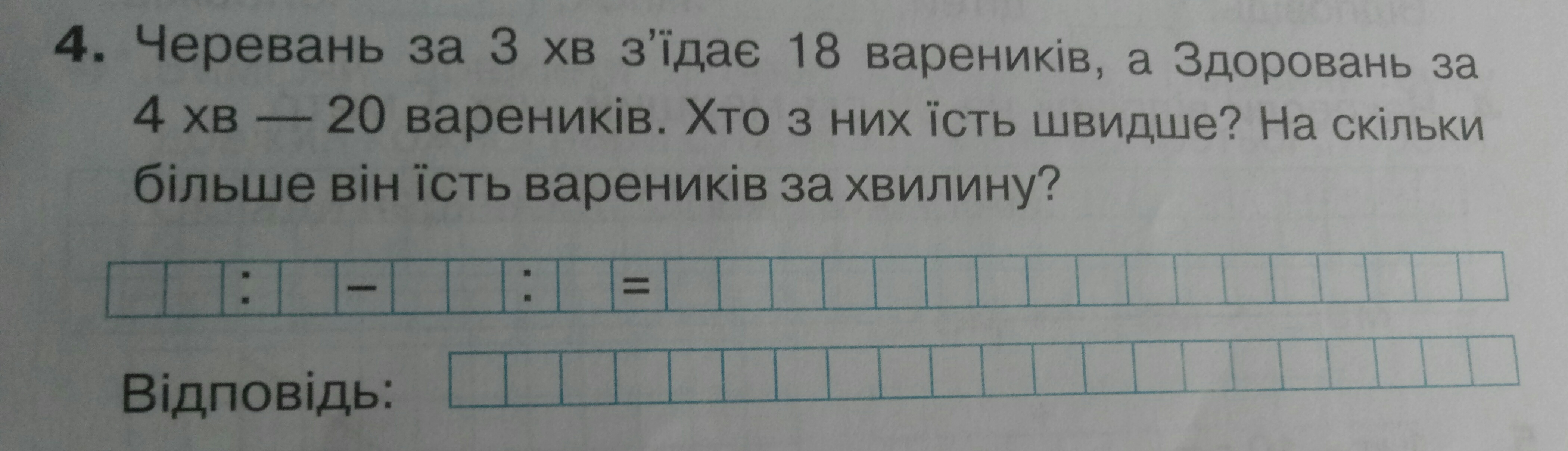 18:3-20:4=6-5=1 (в.)-на столько быстрее ест Черевань