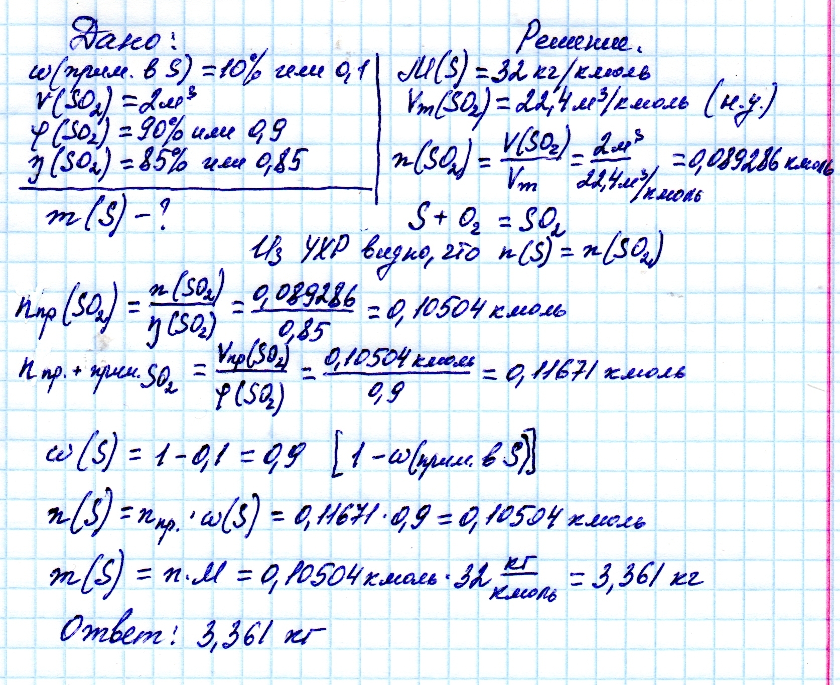 Сера содержит 10% примесей.Какую массу серы нужно взять для получения 2м^3 (н.у.) сернистого газа с объемной долей SO2 в нем 90%,если выход SO2-85%