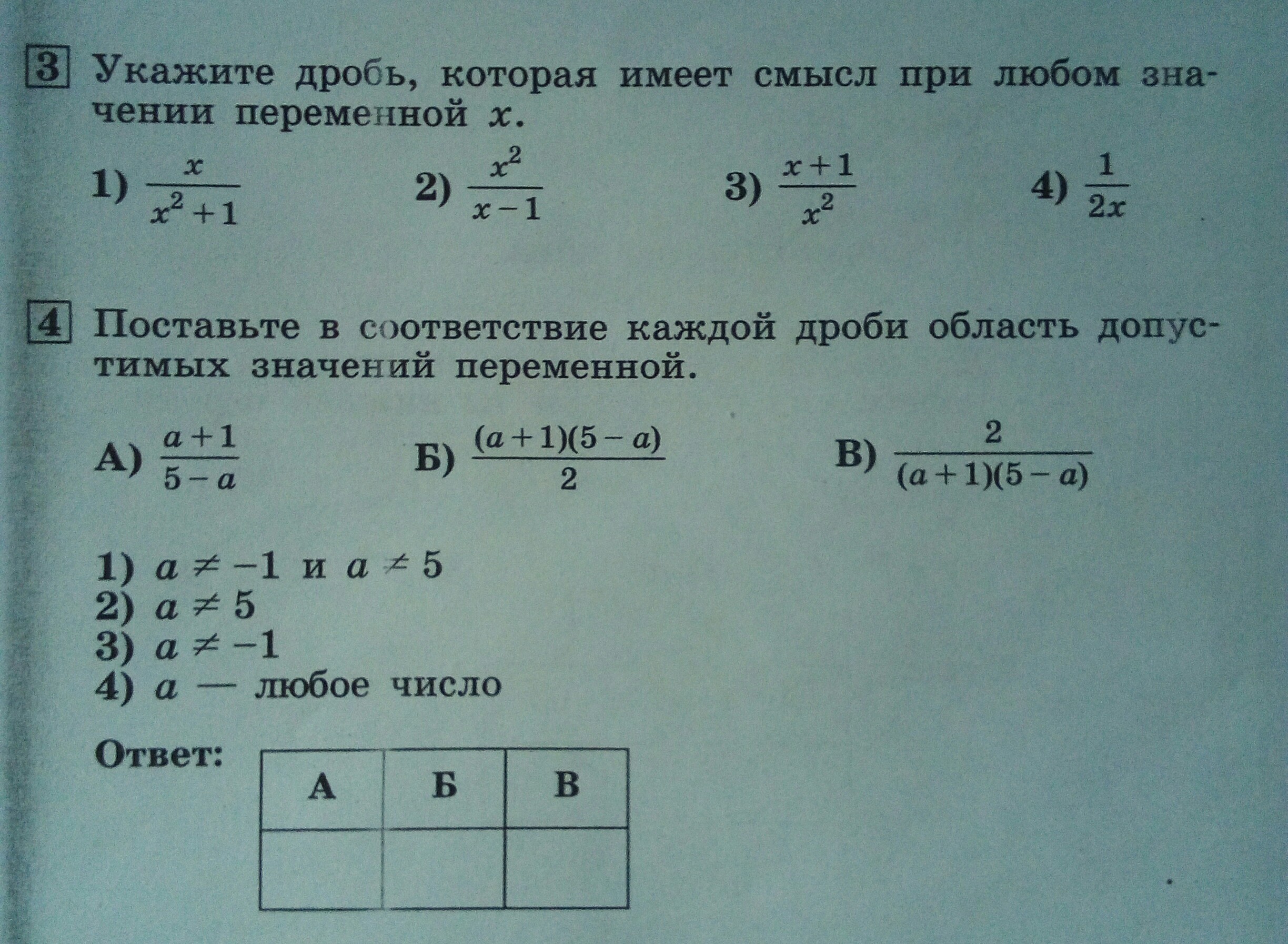 дробь В имеет смысл если в знаменателе будет число отличное от 0, там произведение, значит оба множители должны быть отличны от 0, таким образом а не должно быть равно -1 и 5