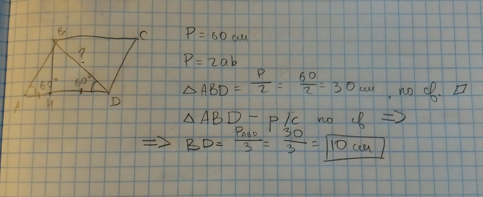 В параллелограмме ABCD угол A равен 60 градусов высота BH делит сторону AD на две равные части найти длину диагонали B D если периметр параллелограмма равна 60 см и чертеж пожалуйста