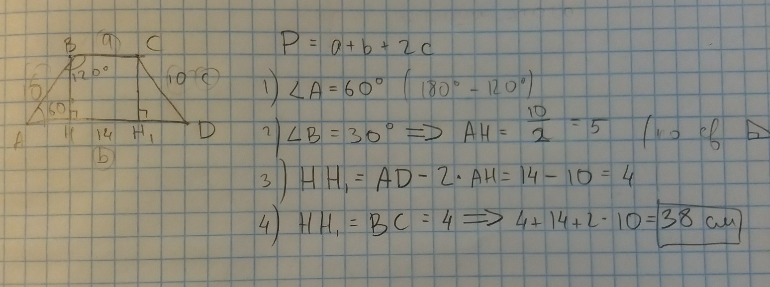 дано АBCD -равнобедренная трапеция угол B=120градусов AD=14см CD=10см
