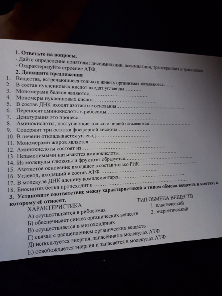 2. рибоза,дезоксирибоза. 3.нуклеотиды 4.Мономерами нуклеиновых кислот служат нуклеотиды. Нуклеотид — органическое соединение, состоящее из азотистого основания (аденин, тимин, урацил, гуанин, цитозин), пятиуглеродного сахара (пентозы) — рибозы или дезоксирибозы и остатка фосфорной кислоты 5.аденин (A), гуанин (G), цитозин (C), которые входят в состав как ДНК, так и РНК. Тимин (T) входит в состав только ДНК, а урацил (U) встречается только в РНК. 6, незнаю, 7Денатурация- это процесс белков — изменение нативной конформации белковой молекулы под действием различных дестабилизирующих факторов. Аминокислотная последовательность белка не изменяется. 9. содержит три остатка фосфорной кислоты, Молекула АТФ ,между которыми имеются две макроэргические связи, поэтому АТФ может выполнять функцию аккумулятора и переносчика энергии. 10 незнаю 11, глицерин и жирные кислоты. 12белка (не точно) мож проверить. 13.Незаменимые называются аминокислоты — необходимые аминокислоты, которые не могут быть синтезированы в том или ином организме. 14. молекула сахарозы. 15 относят аденин (A), гуанин (G), цитозин (C), которые входят в состав как ДНК, так и РНК. Тимин (T) входит в состав только ДНК, а урацил (U) встречается только в РНК. 16.Моносахорид . 17.Тимин 18.в клетке