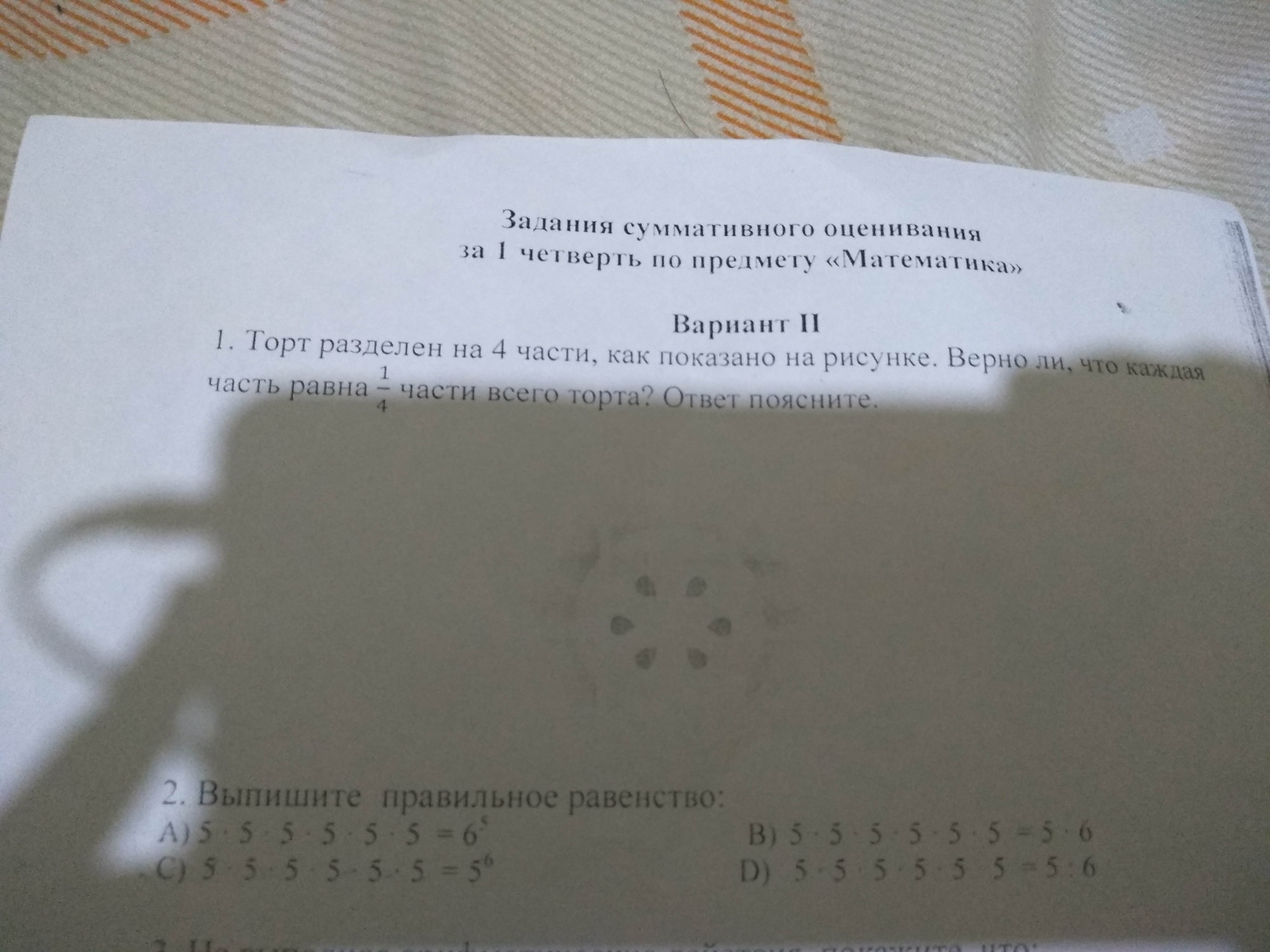 Торт разделен на 4 части,как показано на рисунке.Верно ли,что каждая часть равна 1/4 части торта?ответ поясните.