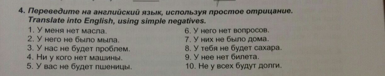 i don't have butter.he didn't have soap.we will have no problems.no one will have cars.we won't have wheat.he has no questions.they had no houses.you won't have sugar.no no ticketsnot everyone will have debts. Отмет лучий вопрос 5 звезду