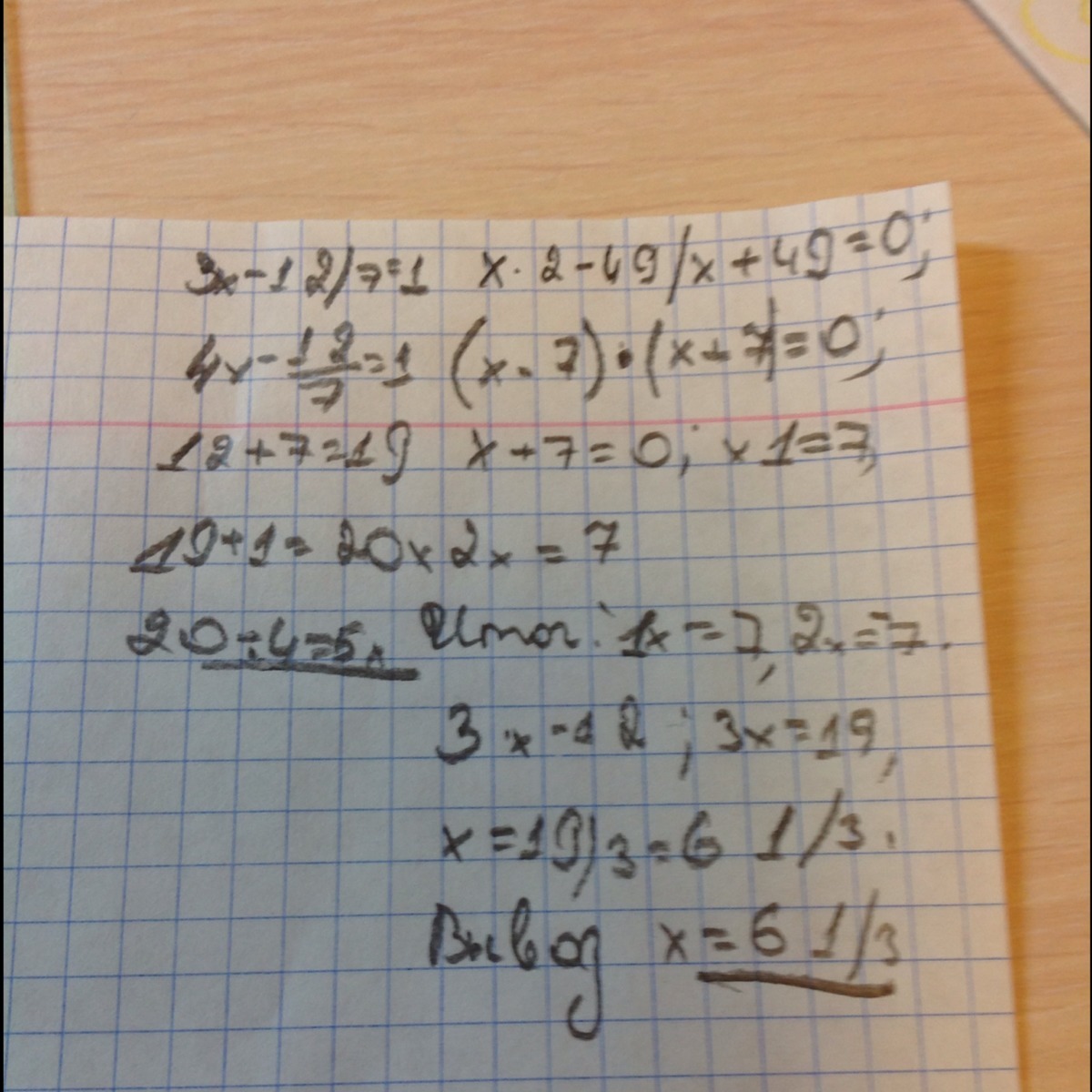 1). x не должен равняться (-49). получаем: x^-49=0; (x-7)*(x+7)=0; x-7=0 или x+7=0. x1=7, x2= -7. Ответ: x1=7, x2= -7. 2). 3x-12=7; 3x=19; x=19/3= 6 1/3. Ответ: x= 6 1/3.