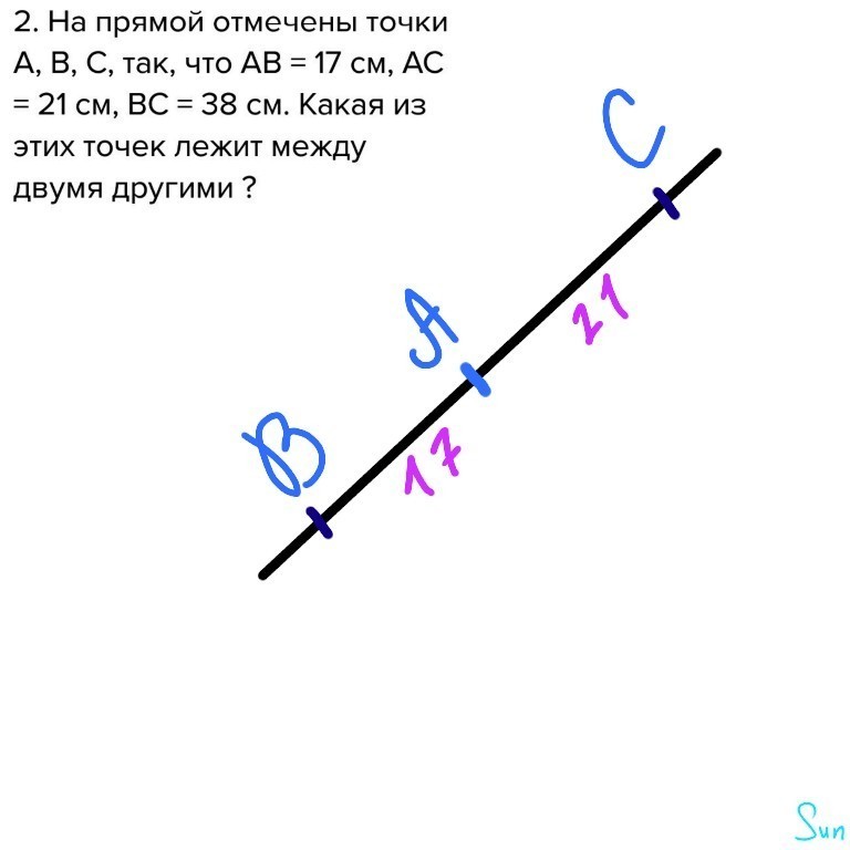 2. Точка А лежит между В и С , т.к. ВС - самый длинный отрезок , то есть