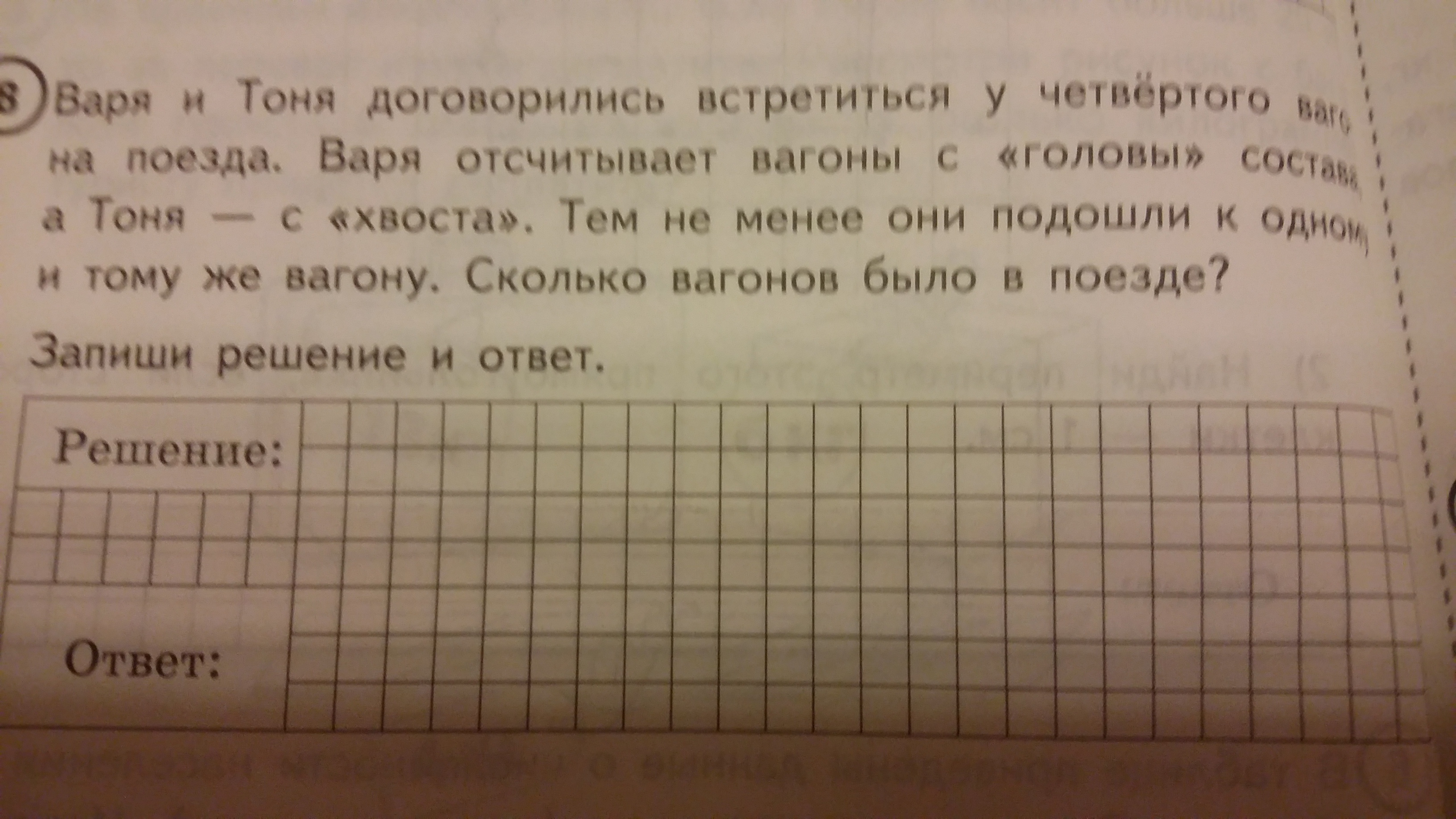 Если они договорились встретиться в 4 вагоне поезда, а они встретились в 4, считая с начала и конца, то вагонов в поезде 7. То есть, если упростить немного чертёж с помощью счёта вагонов (1, 2, 3, 4, 3, 2, 1), то вагонов всего 7.