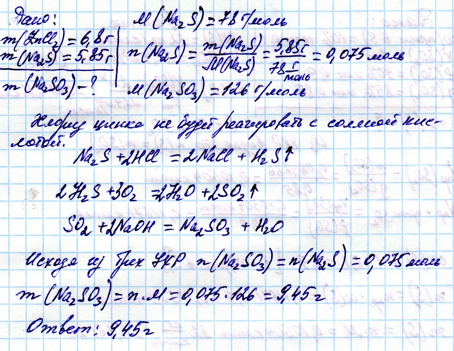 95 баллов......Осадок, образовавшийся после смешивания растворов, содержащих 6.8 г хлорида цинка и 5.85 г сульфида натрия, обработали избытком соляной кислоты. Выделившийся газ сожгли в избытке кислорода, и продукты сгорания растворили в избытке раствора гидроксида натрия. Определите массу образовавшейся соли.
