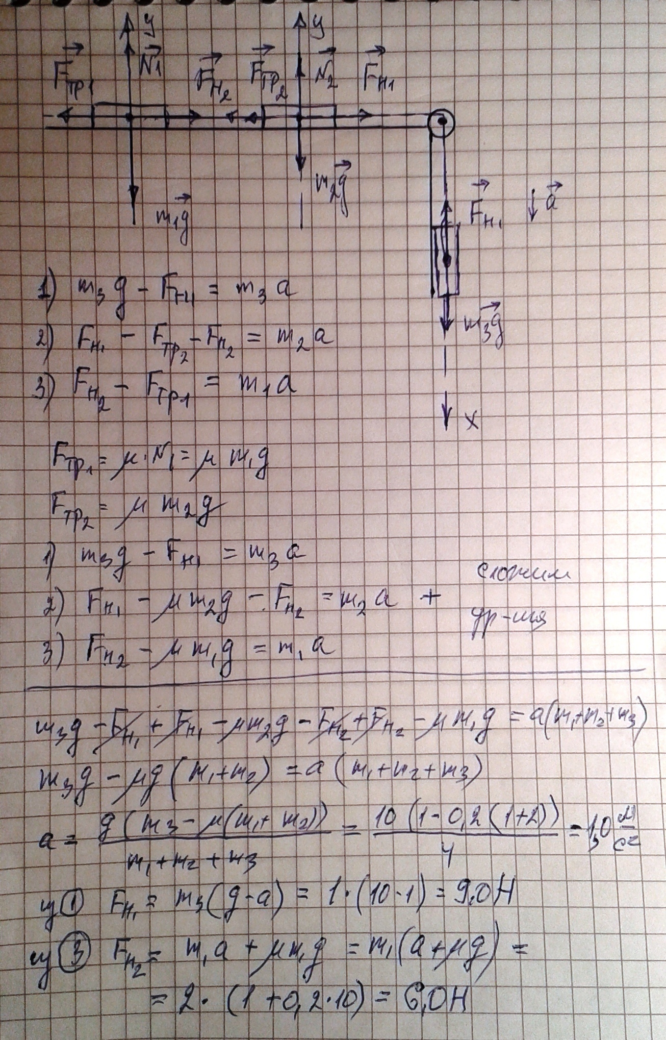 По горизонтальной поверхности перемещаются два тела под действием третьего, связанного с первыми двумя нитью, перекинутой через неподвижный невесомый блок. с каким ускорением будут перемещаться тела? чему равна сила натяжения нити между первым и вторым, вторым и третьим телами, если массы тел равны соответственно 2, 1 и 1 кг, а коэффициент трения 0,2?