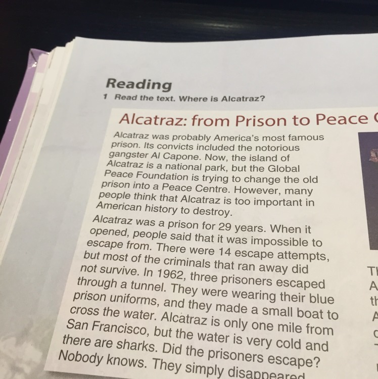 Алькатрас был тюрьмой в течение 29 лет. Когда она открылась, люди говорили, что из неё невозможно сбежать. Было всего 14 попыток побега, однако многие попытавшиеся сбежать — не выжили. В 1962 году трое заключённых сбежали через туннель. На них была их синяя форма заключенных, а также они соорудили небольшую лодку, чтобы пересечь воду. Алькатрас находится всего в одной миле от Сан-Франциско, но воды — очень холодные, и в ней присутствуют акулы. Сбежали ли заключенные? Никто не знает. Они просто-напросто исчезли.