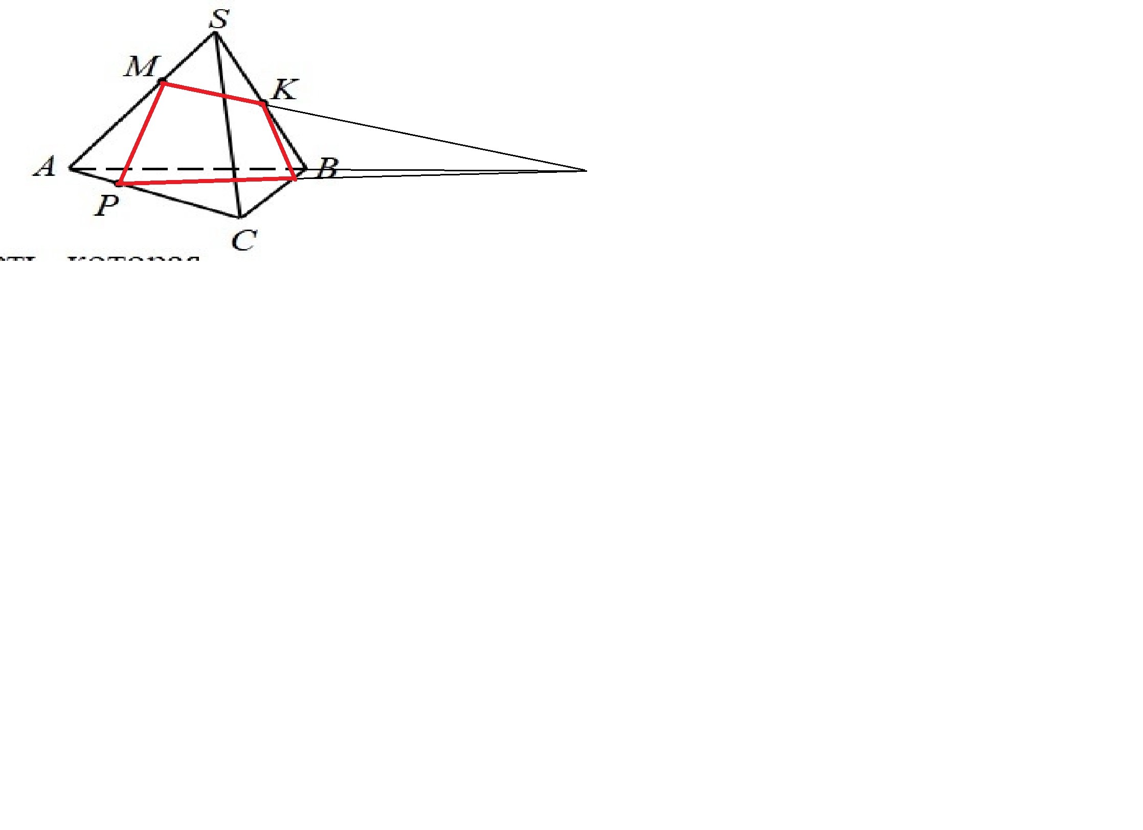 Постройте сечение пирамиды SABC плоскостью, которая проходит через точки M, K, P, что принадлежат ребрам SA, SB, AC соответственно.