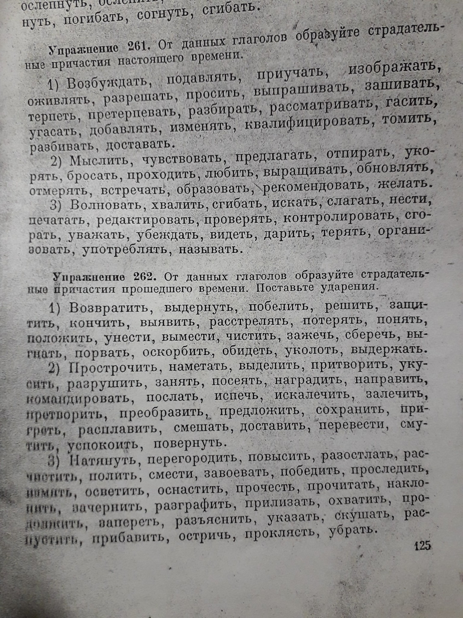 3. Волновать – волнуемый; хвалить – хвалимый; сгибать – сгибаемый; искать – нет; слагать – слагаемый; нести – несомый; печатать – печатаемый; редактировать – редактируемый; проверять – проверяемый; контролировать – контролируемый; сгорать – (непереходный); уважать – уважаемый; убеждать – убеждаемый; видеть – видимый; дарить – даримый; терять – теряемый; организовать – организуемый; употреблять –употребляемый; называть – называемый.