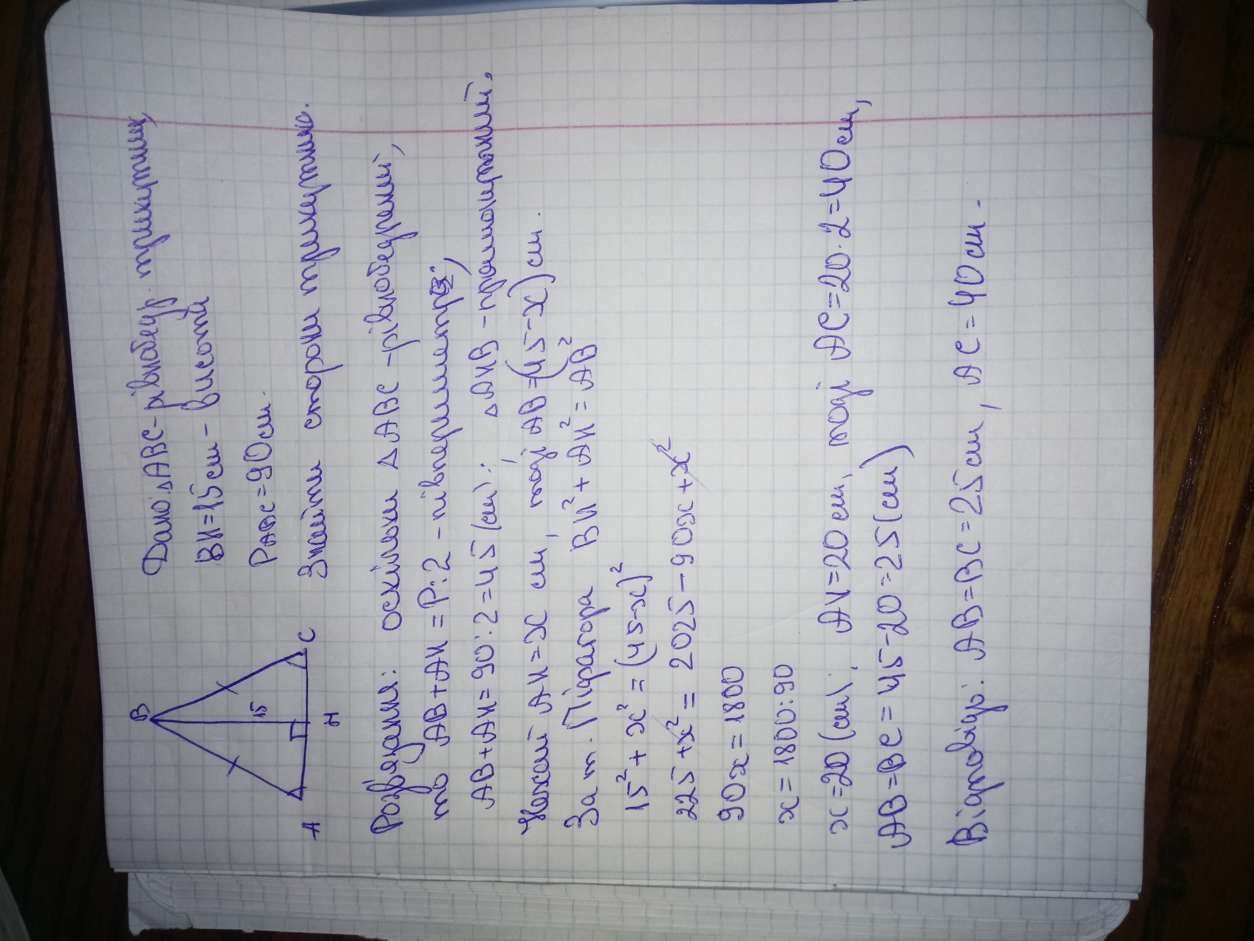периметр рівнобедреного трикутника дорівнює 90см а висота проведена до основи 15 см знай ти сторони трикутника