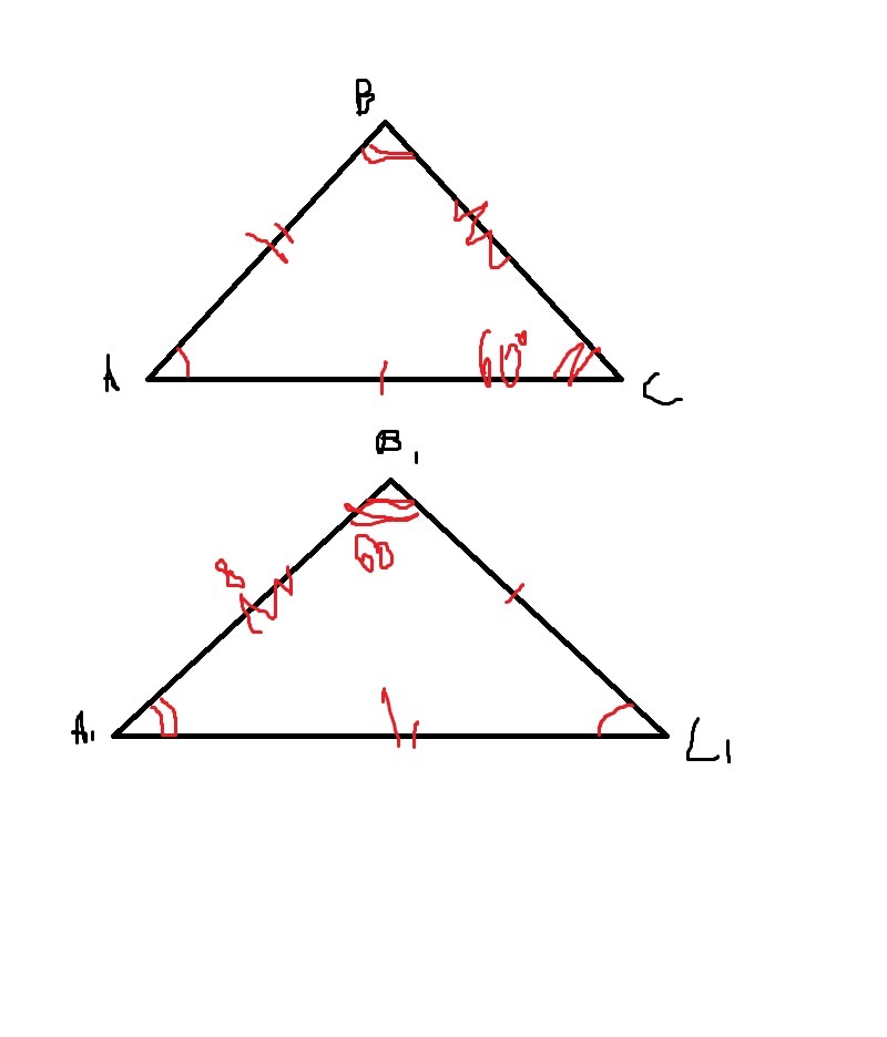 треугольник А1В1С1 равен треугольнику АВС, причём В1С1=АС, А1С1=АВ. а) найдите В1А1 и угол С, если <В1=60* , ВС=8 м. б) может ли периметр треугольника АВС быть равным 2АС+3В1С1 , если известно, что все его стороны равны?