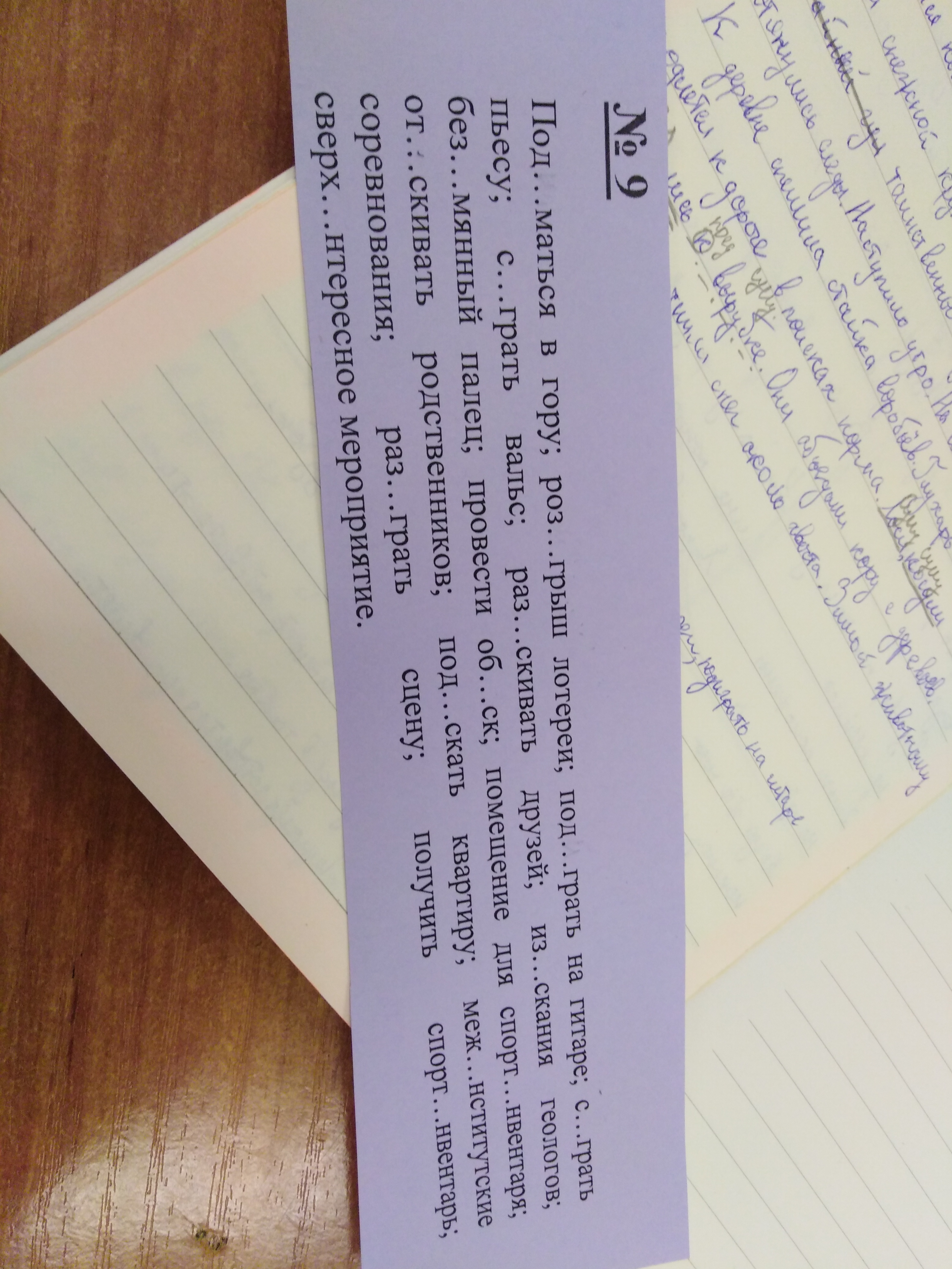 Подниматься в гору; Розыгрыш лотереи; Подиграть на гитаре; Сыграть пьесу; Сыграть вальс; Разыскивать друзей; Изыскания геологов; Безымянный палец; Повести обыск; Помещение для спортинвентаря; Отыскать родственников; Подыскать квартиру; Межинститутские соревнования; Разыграть сцену; Получить спортинвентарь; Сверх интересное мероприятия.