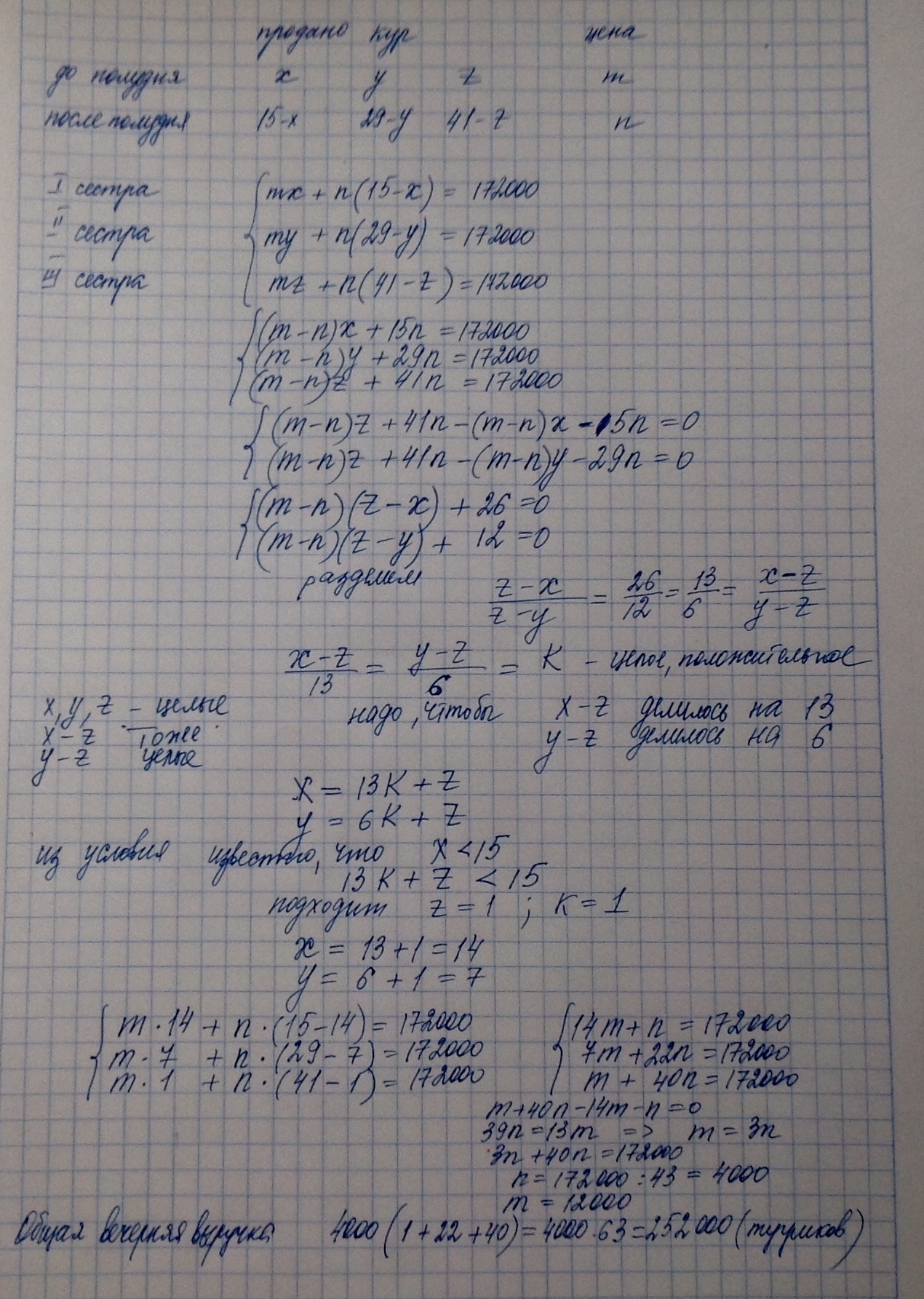 Три сестры пришли на рынок и торговали поштучно цыплятами. Первая принесла 15 цыплят,а вторая 29,третья-41. Каждая из них часть товара продала утром ,а часть-вечером. Утренняя цена была у всех одинаковая,вечерняя цена тоже была одинакова,но ниже утренней. К вечеру весь товар был распродан ,и дневная выручка у всех оказалась одинаковой:172000 тугриков. Найдите общую вечернюю выручку.