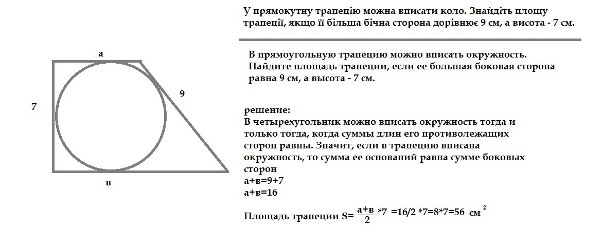 У прямокутну трапецію можна вписати коло. Знайдіть площу трапеції, якщо її більша бічна сторона дорівнює 9 см, а висота - 7 см.