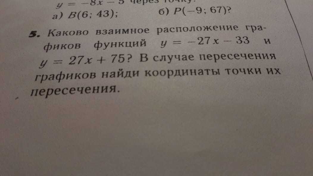 прямые пересекаются. получаем: -27x-33=27x+75; -27x-27x=75+33; -54x=108; x=108/(-54)= -2. y= -27*(-2)-33=54-33=21. Ответ: точка А (-2:21).