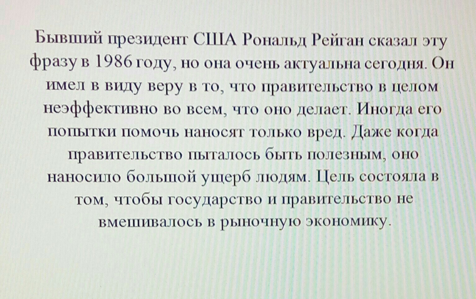 The last president of USA Ronald Regan said this phrase in 1986,but it is very relevant nowadays.He meant the faith that the government isn`t effective at all. Sometimes the attempts to help get only damage. Even when the government was trying to be useful, it was getting a big damage to people. The purpose was that the state and the government didn`t take part in the market economy.
