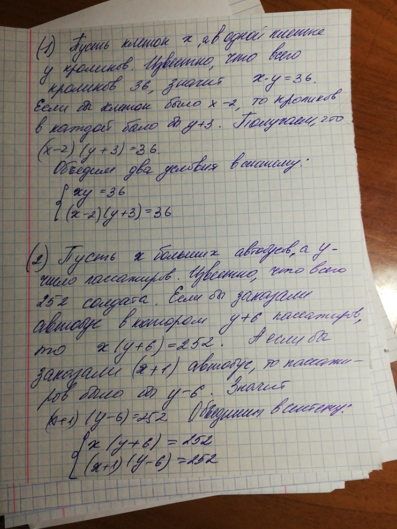 клеток было на 2 меньше то в каждую пришлось бы посадить на 3 кролика больше.Сколько было клеток ? 2.Переведите условия задачи на математический язык . Буквой x обозначьте число больших автобусов , а буквой y - число пассажиров которых большой автобус может перевезти.Для перевозки 252 солдат были заказаны автобусы . Если бы заказали большие автобусы , в каждый из которых можно было усадить на 6 человек больше , то потребовалось бы на один автобус меньше,чем было заказано.Сколько больших автобусов потребовалось бы для перевозки солдат ?