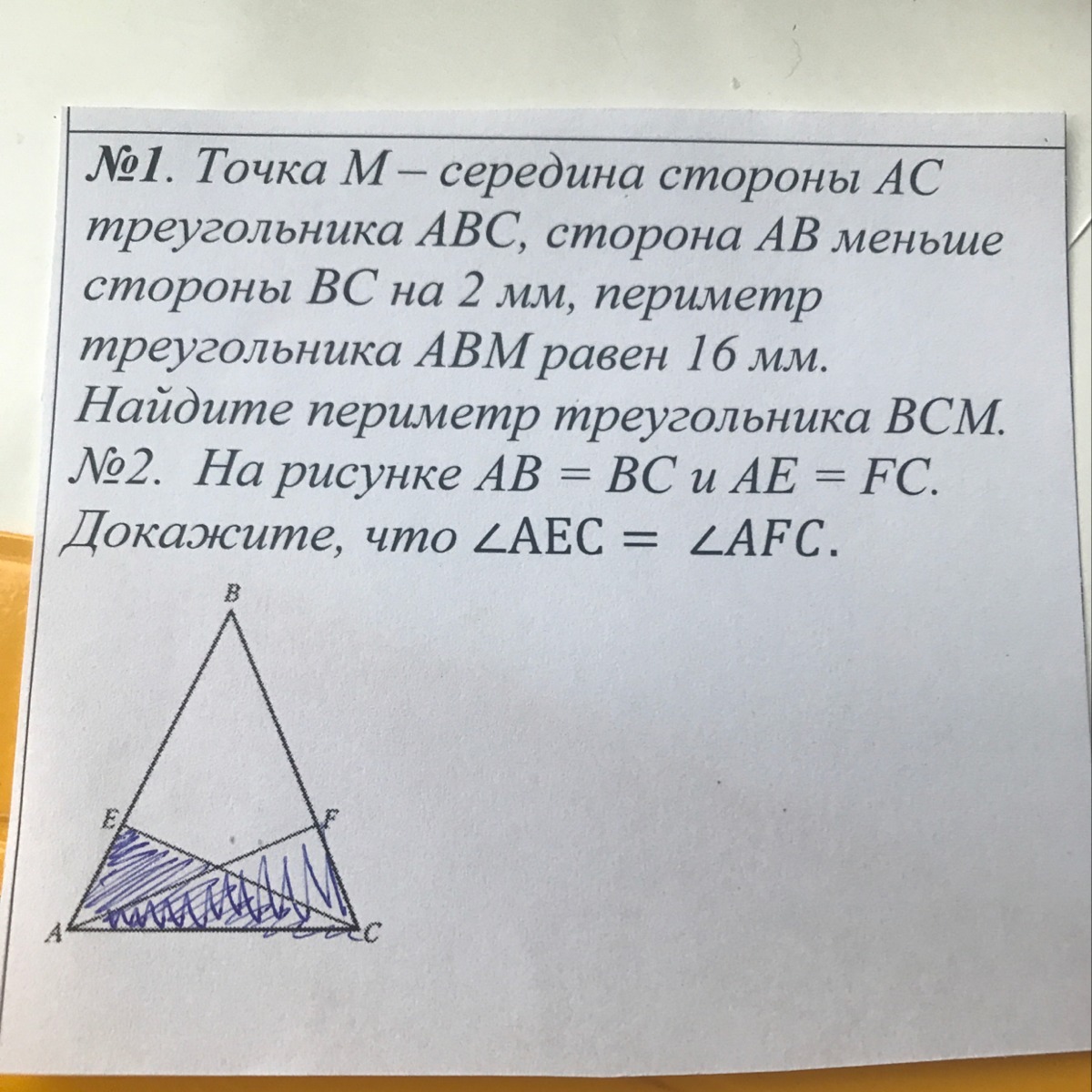 1.Т.к точка M-середина отрезка AC, то ABM=BMC. Т.к P(ABM) = 16 мм, то P(BMC) =16+2=18мм.